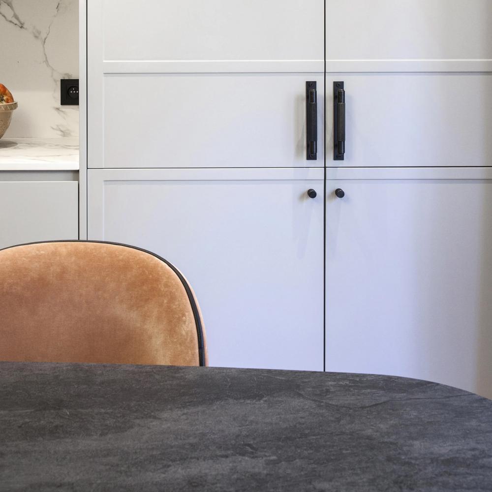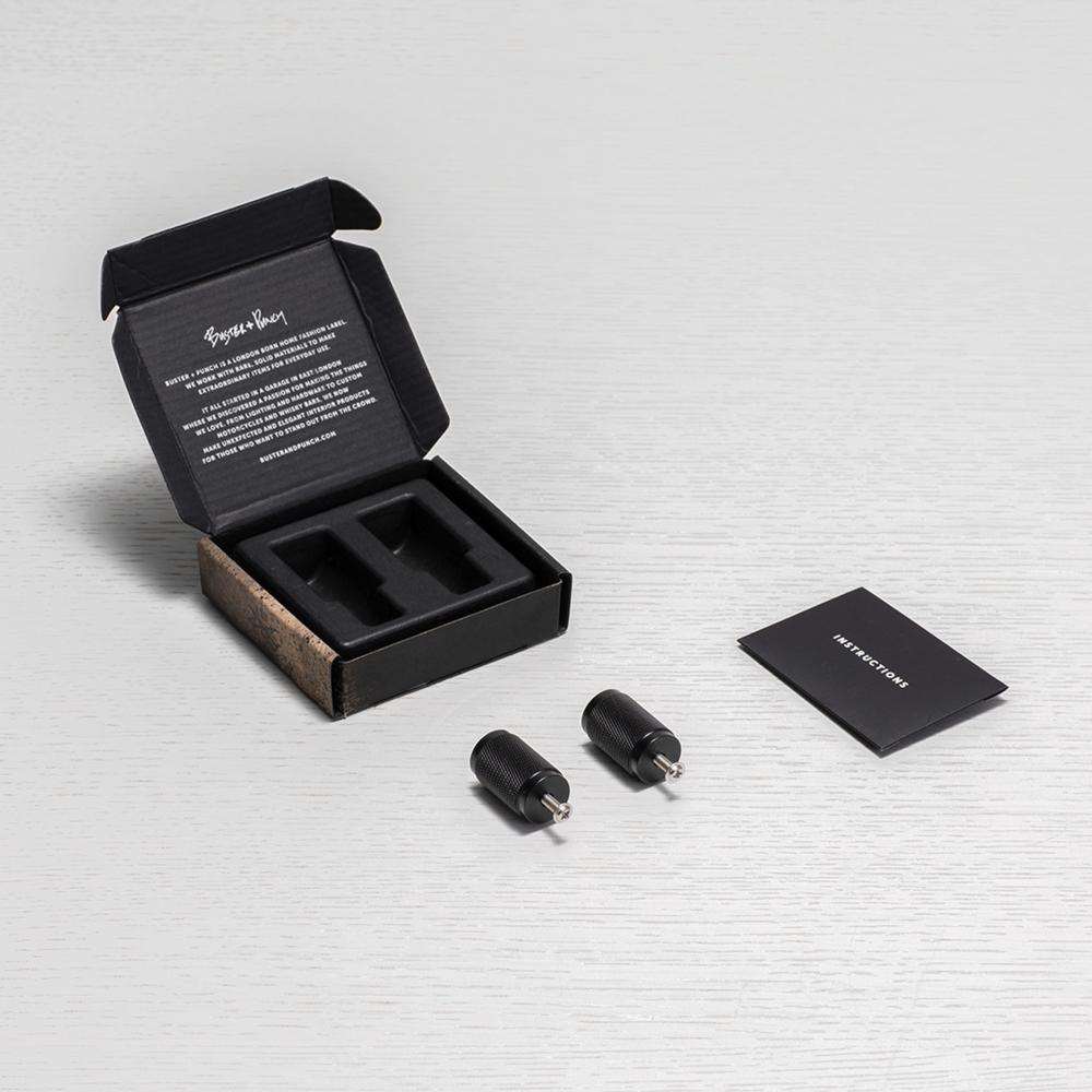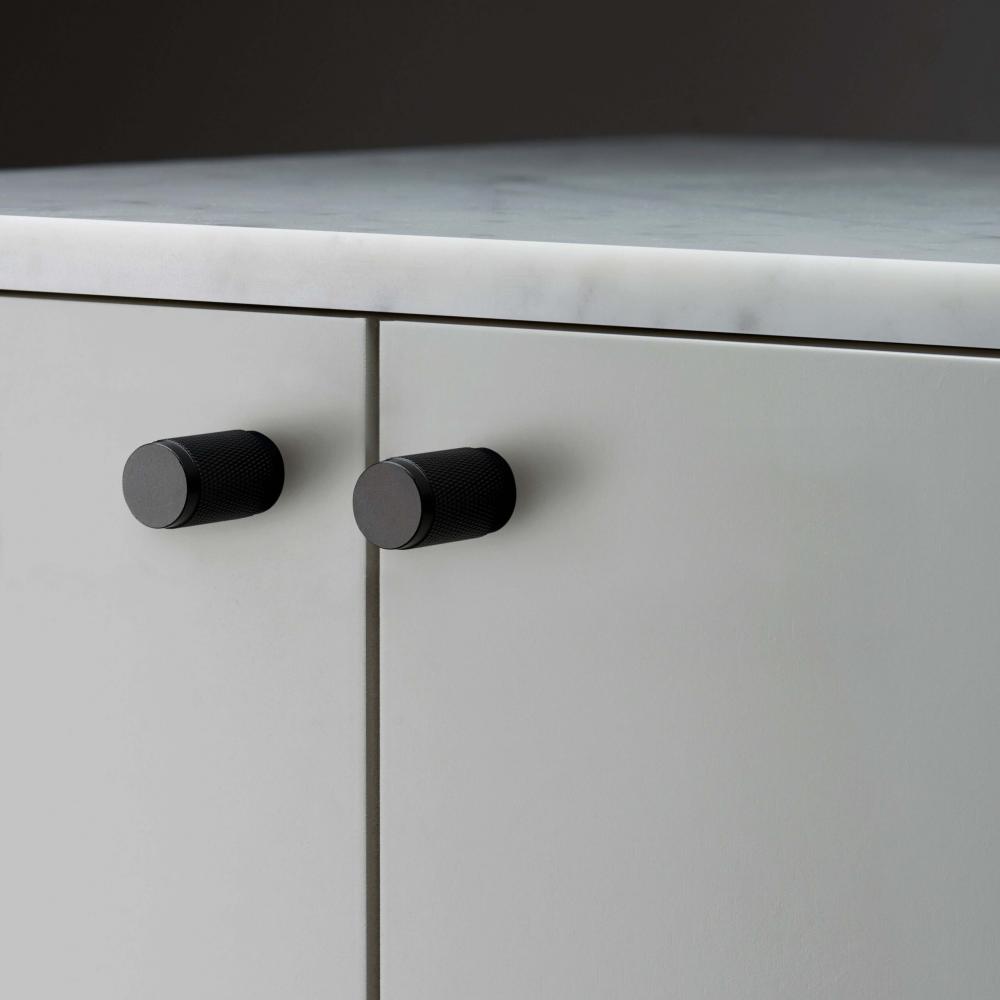 A pair of furniture knobs made from solid black anodised metal. These knobs feature our signature, diamond-cut, cross-knurl pattern and are refined by hand.