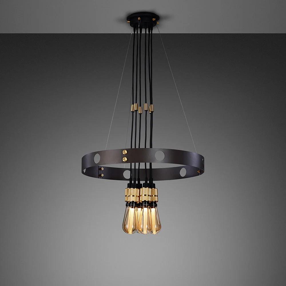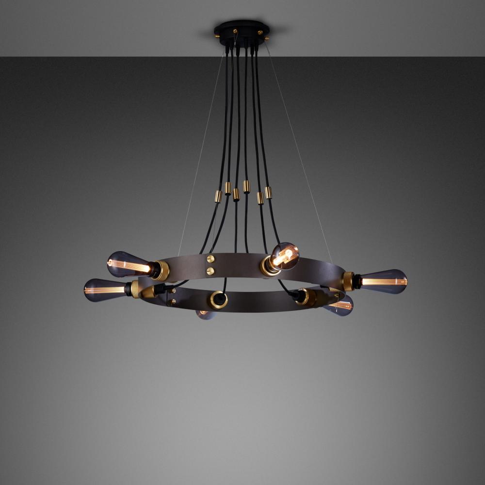 Chandelier in solid metal featuring our cross-knurl pattern with a graphite metal ring.