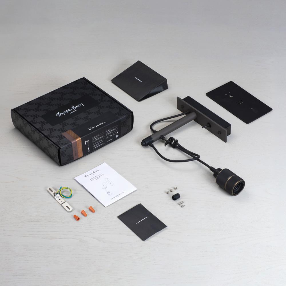 Wall light with graphite base and solid metal details featuring our cross-knurl pattern, no shade. Can be fitted as standalone or connected to a US outlet box.