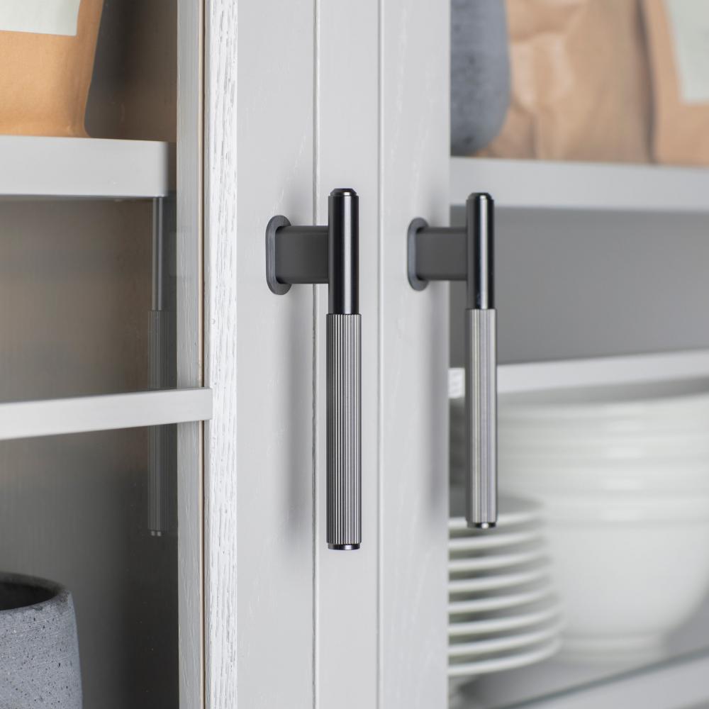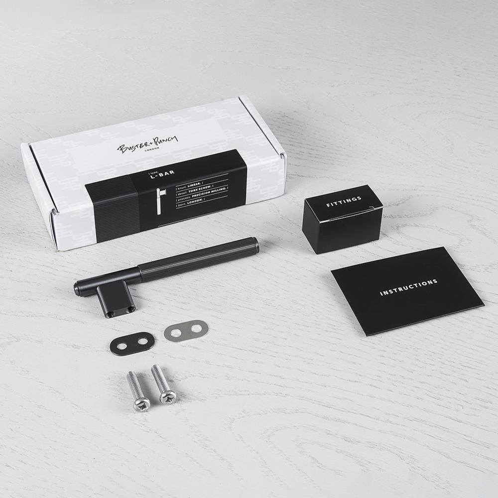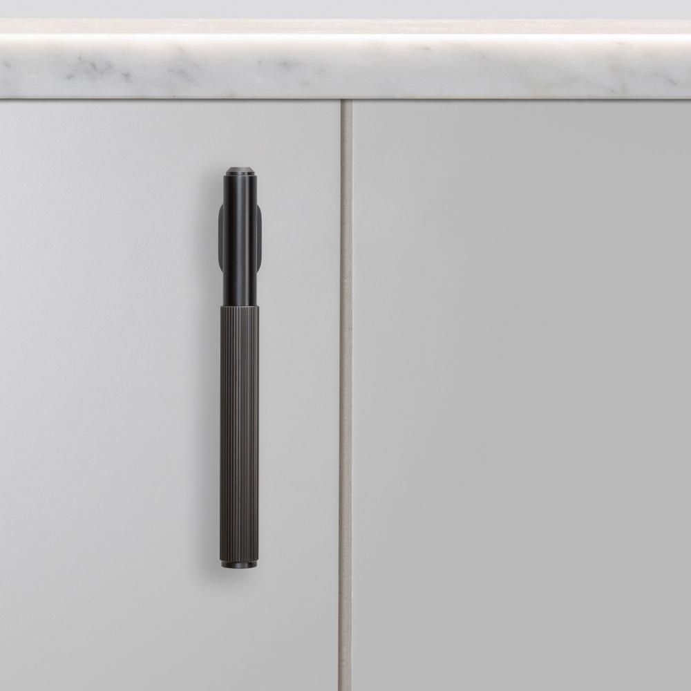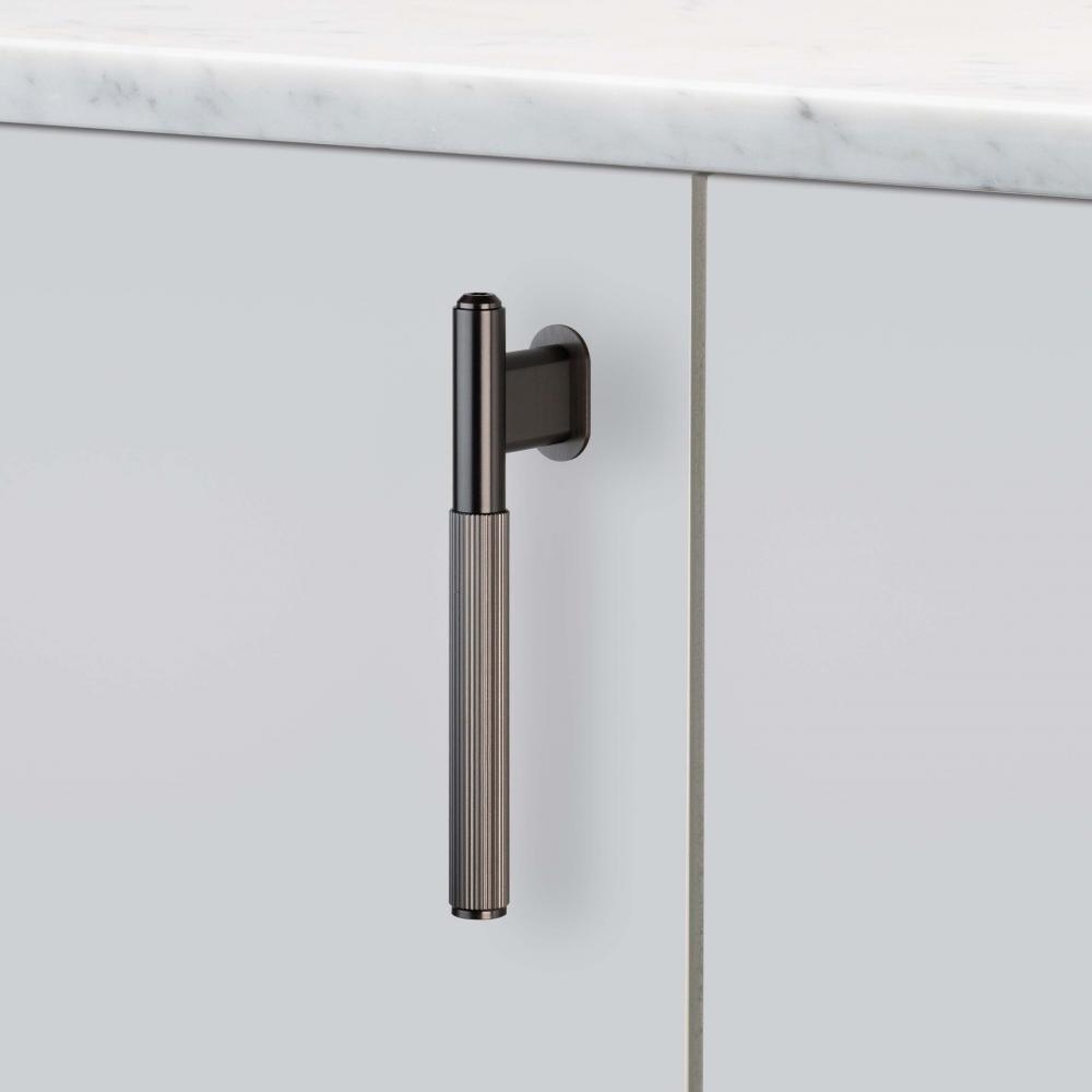 An L-bar made from solid stainless steel and finished in gun metal PVD. This L-bar features our signature, diamond-cut, linear knurl pattern, a precision milled oval stalk and is refined by hand. It comes with a small, gun metal, oval metal disc.