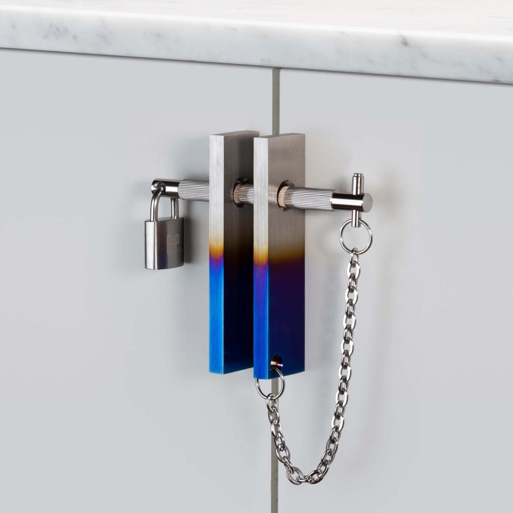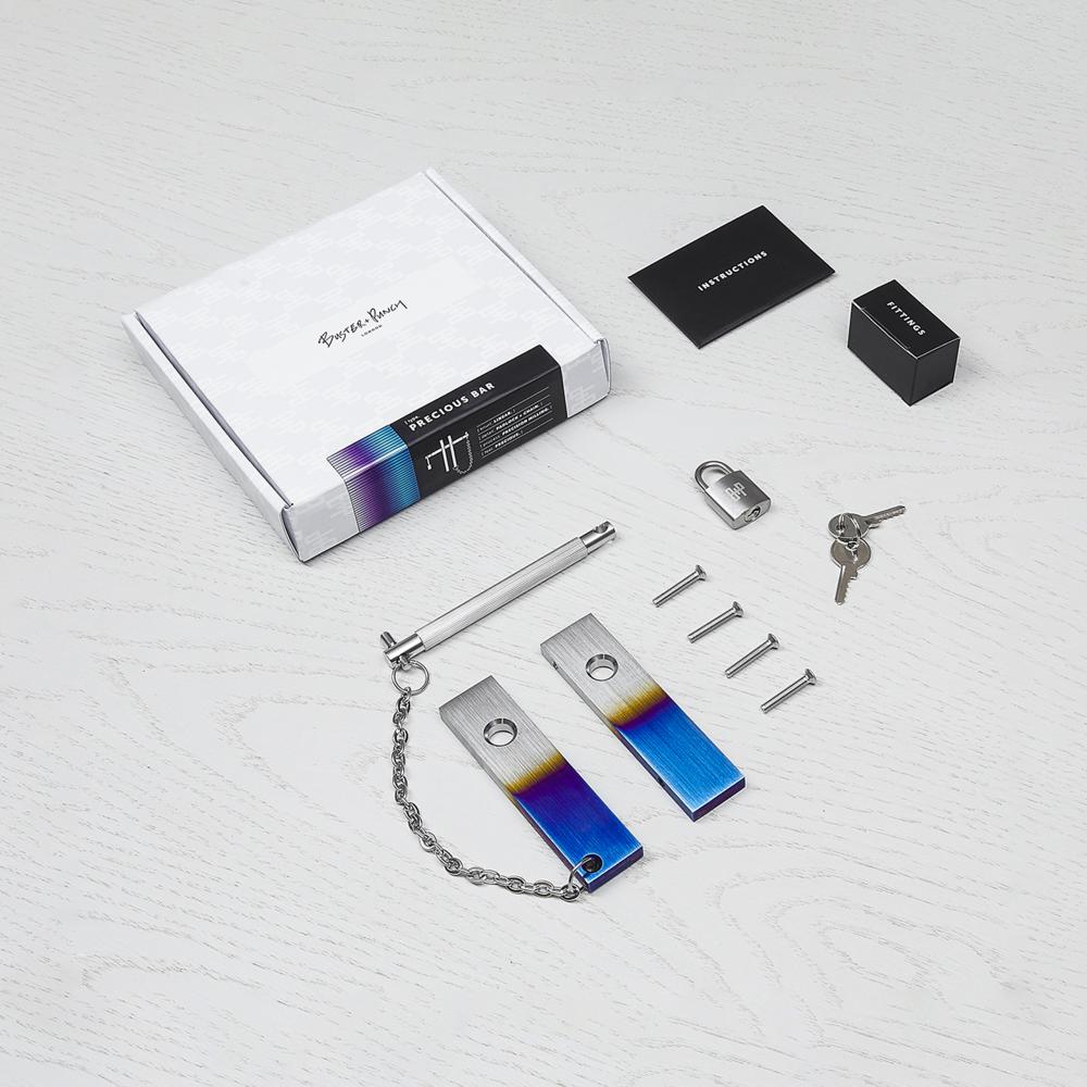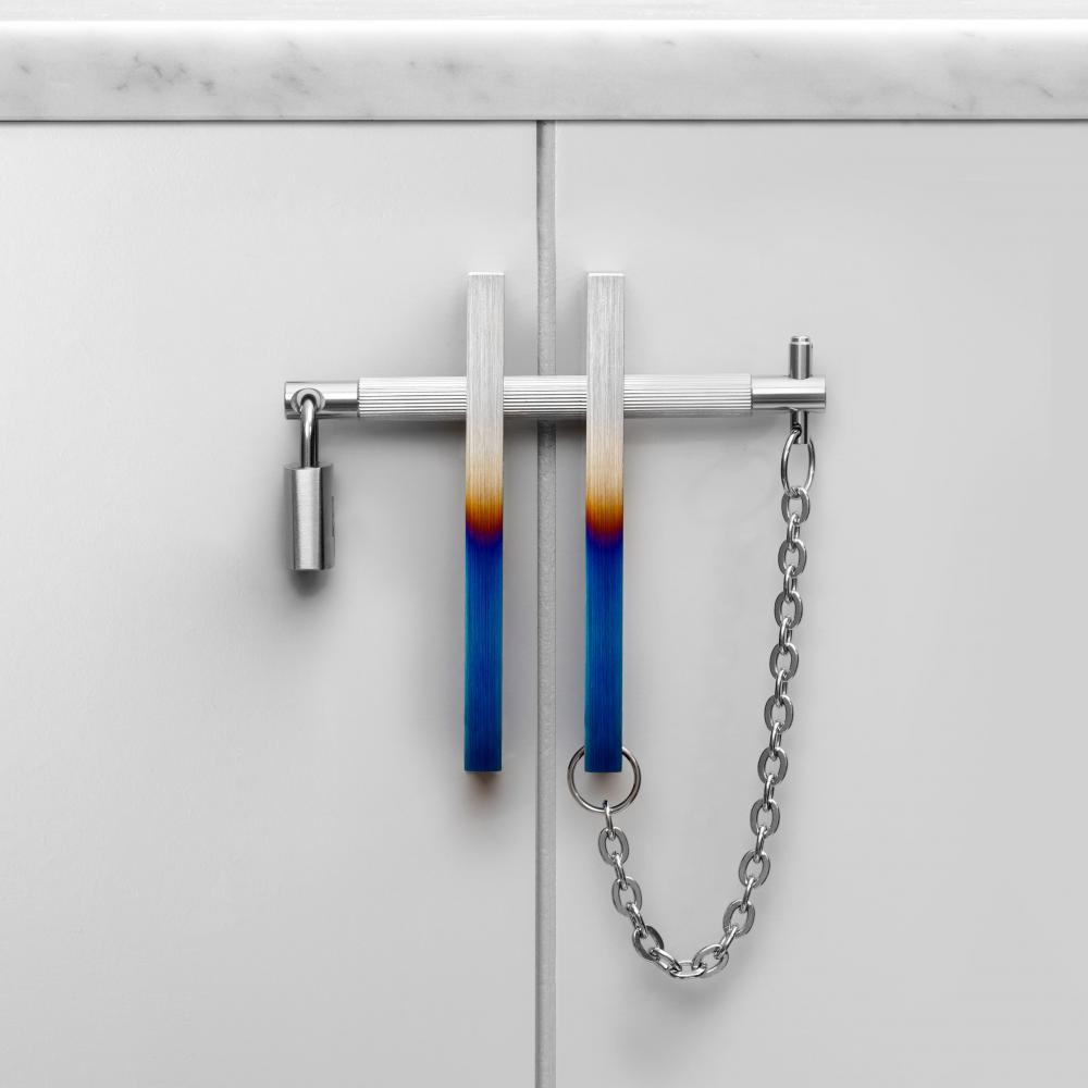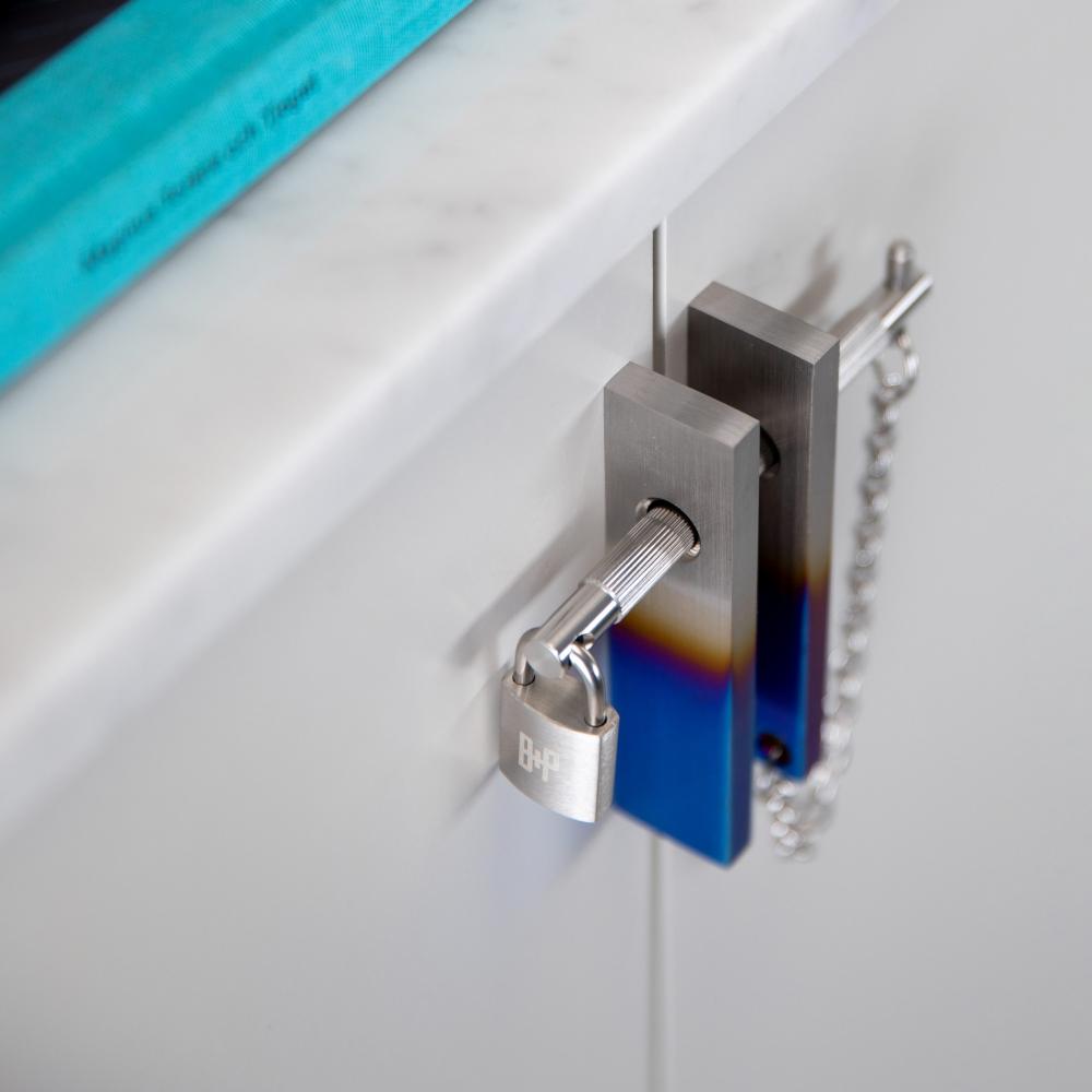 A solid stainless steel horizontal fixing bar features our signature linear knurl pattern and is attached with an elegant steel fashion chain. The fixing bar can be secured in place with our solid steel padlock, with ‘B+P’ logo etched into it.