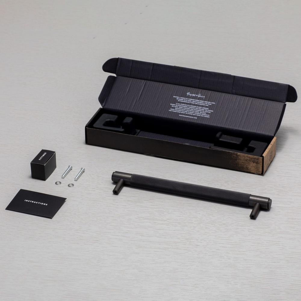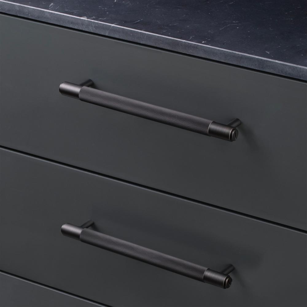 A pull bar made from solid smoked bronze. This pull bar features our signature, diamond-cut, cross-knurl pattern and is refined by hand.