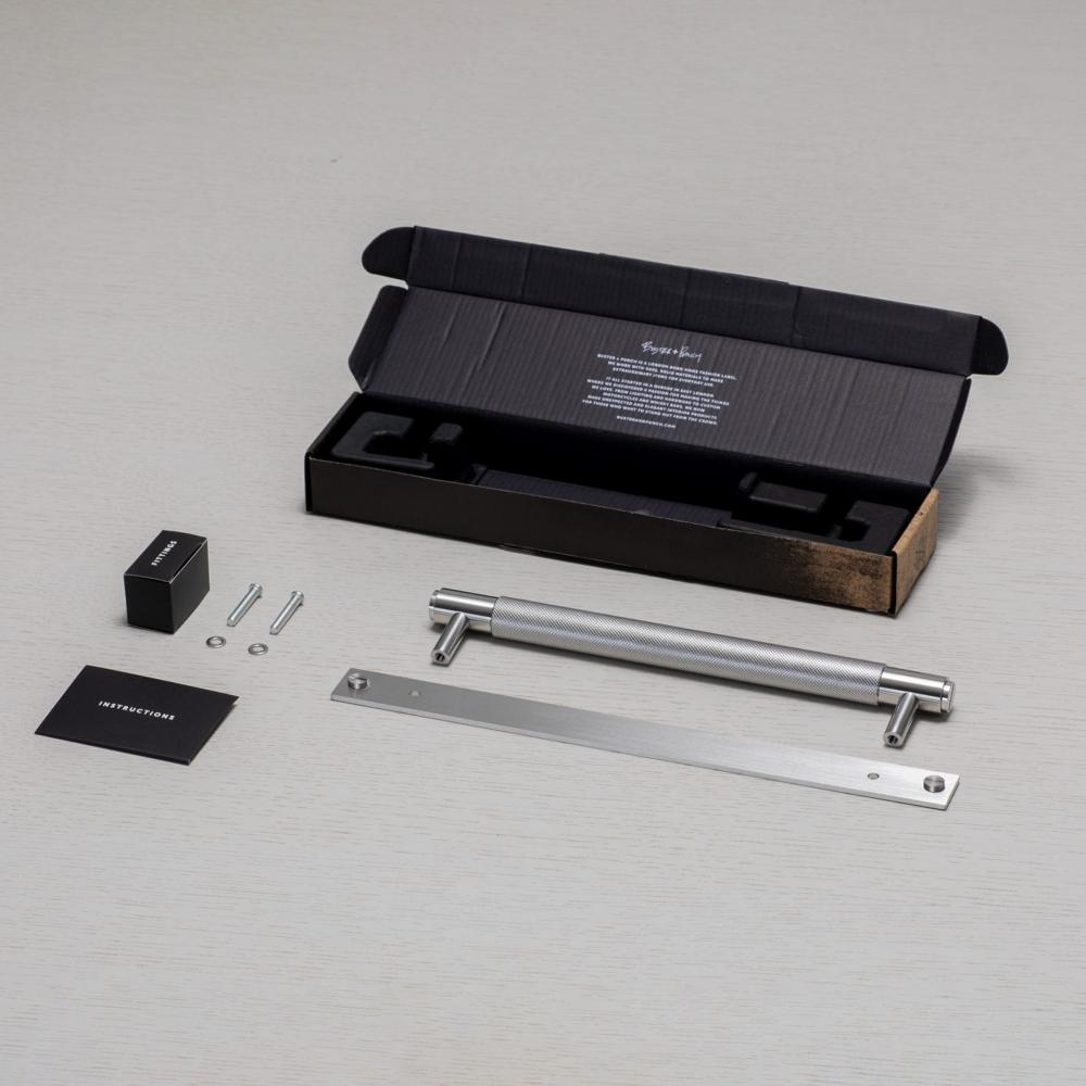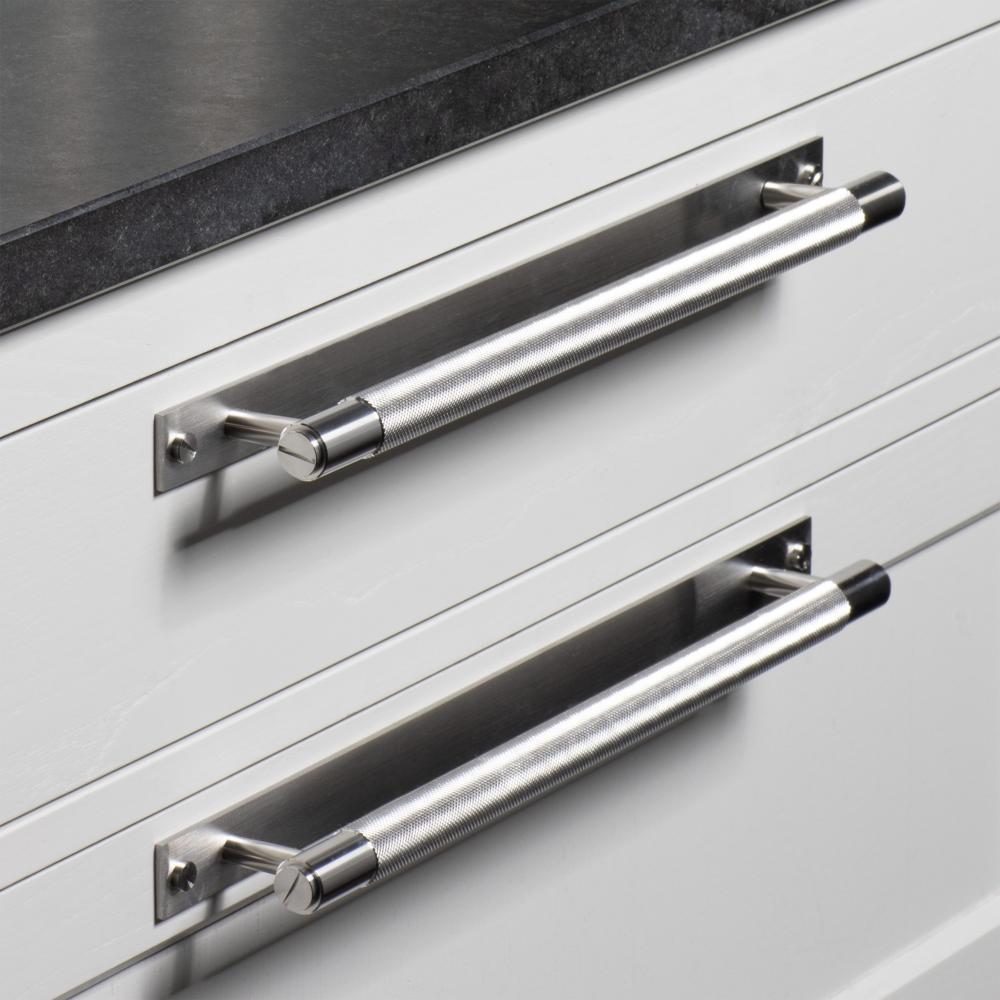 A medium pull bar made from solid metal and featuring our cross-knurl pattern.