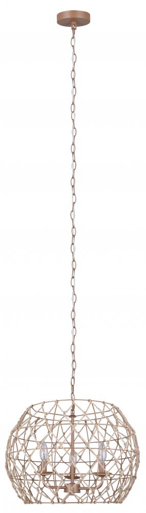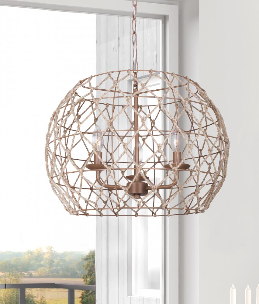 Illuminate Your Space with Elegance and Style: Aura 3 Light PendantTransform your home with the enchanting Aura 3 Light Pendant, a perfect blend of modern design and rustic charm. This exquisite piece features a natural tied rope shade, creating a warm and inviting atmosphere in any room. With its sophisticated yet earthy appeal, the Aura pendant is ideal for living rooms, dining areas, or entryways, making a bold statement while providing ample lighting.Designed with attention to detail, the Aura pendant showcases a sturdy metal frame wrapped in natural tan rope, offering both durability and aesthetic appeal. The 20-inch width and 14-inch height make it a versatile addition to various spaces, and the adjustable chain allows for customization of the hang height to fit your needs perfectly.Whether you’re renovating your home or simply looking to add a touch of elegance, the Aura 3 Light Pendant is the perfect choice to elevate your interior décor.