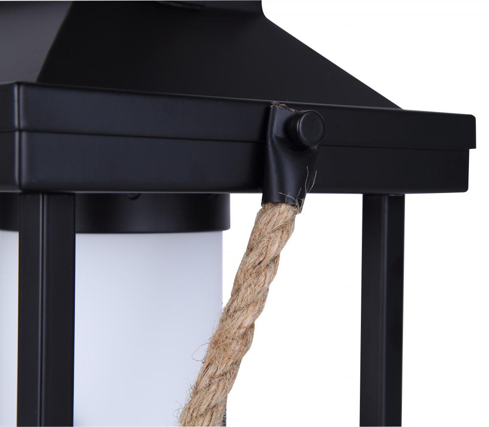 The combination of the matte black finish, natural rope handle, and patterned glass shade ensures both durability and a timeless look that complements any decor style