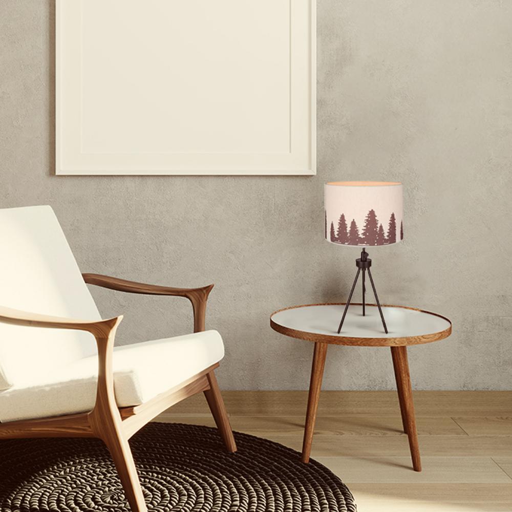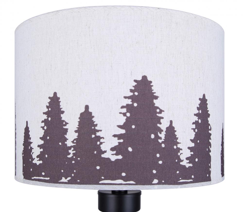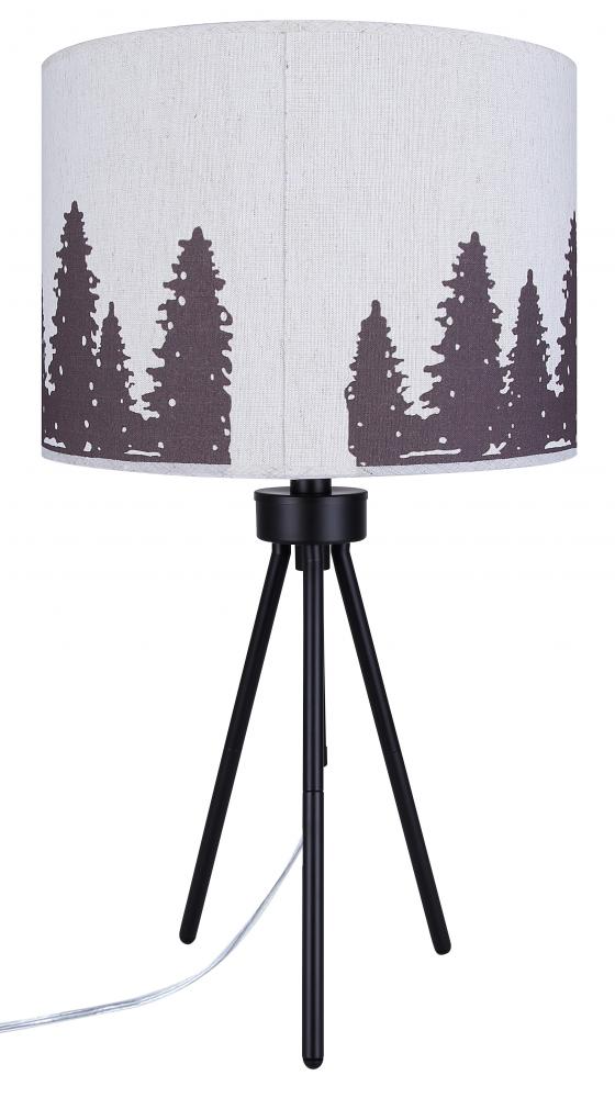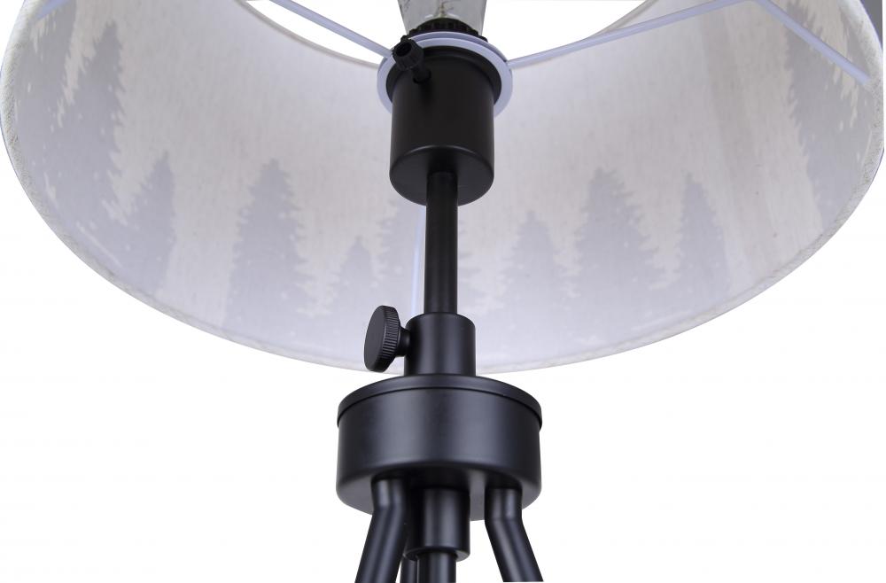Illuminate your space with our distinctive table lamp featuring a shade adorned with charming tree motifs. The classic natural fabric shade contrasts elegantly with matte black tripod legs, offering a blend of modern aesthetics and timeless appeal. Adjustable in height from 22 3/4" to 27 1/4", this lamp accommodates various settings, from bedside tables to living room corners. It includes a tri-light switch on the socket for versatile lighting options, perfect for creating ambiance. Ideal for dry locations indoors, it accommodates one 100W Type A bulb, ensuring ample illumination with a touch of nature-inspired style.