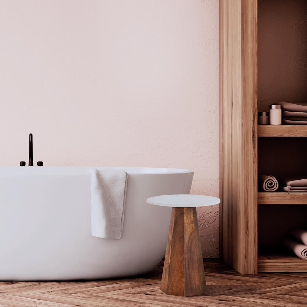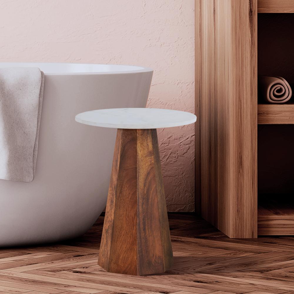 Rustic and Modern Design: The NAYA Natural Wood Side Table features a beautifully crafted natural wood base and a smooth white marble top, combining rustic charm with modern elegance.