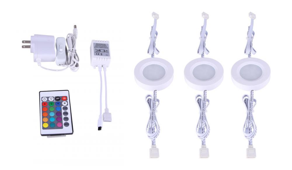 Undercabinet, LUL-14-3-RGB-WH -G-, Linkable LED Puck Light, White Color, RGB, Remote Control, 3 Lights Kit, 3000K, 3 x 150Lumens, 3 x 2 Watt, Non-Dimmable, 1piece 12W driver, 1piece 6 out Ports and 1 in Port Hub, 10 feet Wire on Pucks. 6 feet Power Cord and Plug with Rocker Switch