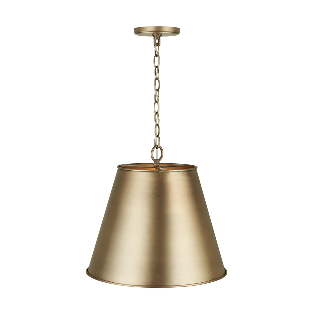 The classic cone-shaped metal shade of this pendant is finished with Aged Brass inside and out. Also available as a linear 3-light island fixture.