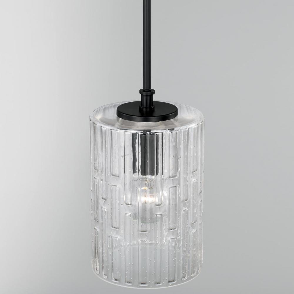 Create a simple and striking statement with the Emerson 1-Light Pendant. This fixture features elongated seeded glass with an embossed geometric pattern sparkles on a clean and classic Matte Black frame.
