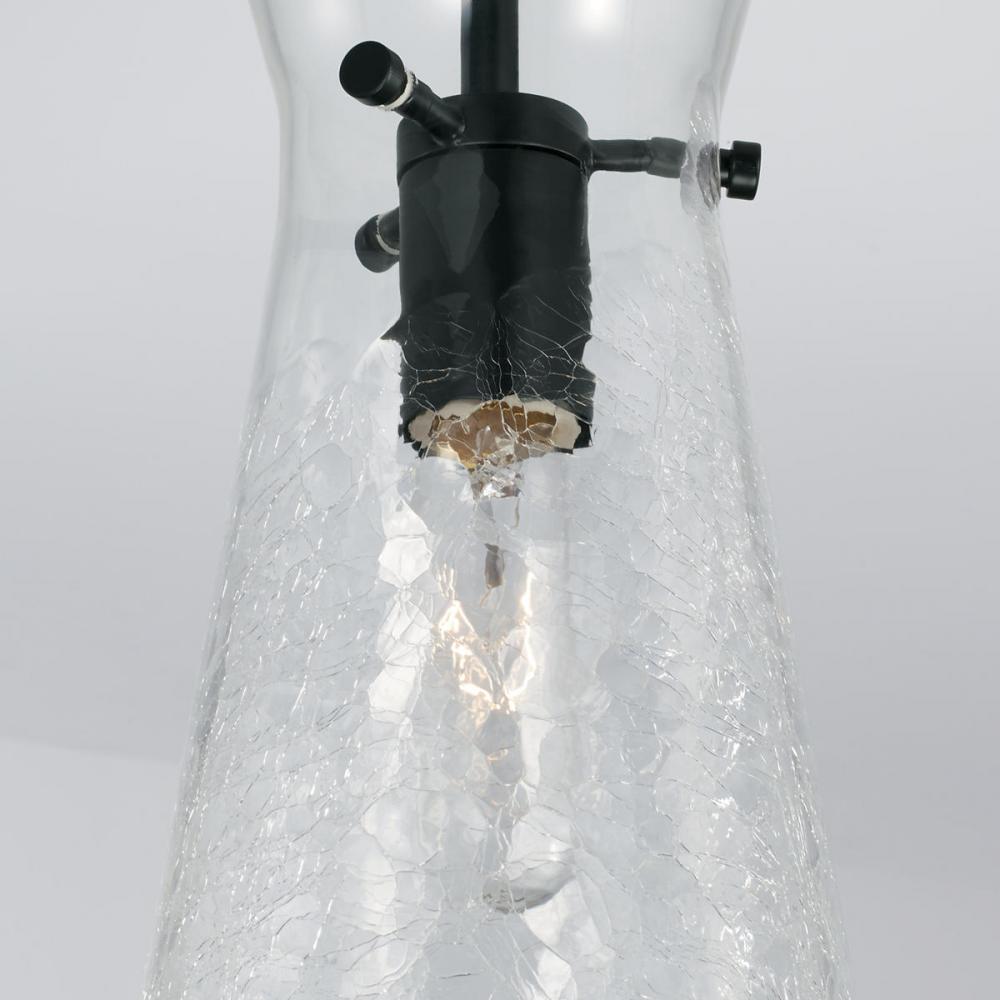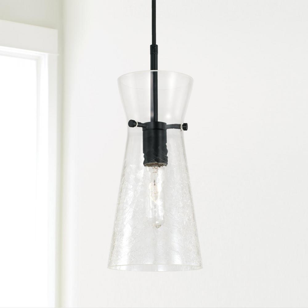 The unique half-crackle detail on the 1-Light Pendant in Matte Black has a visual texture that beautifully complements the tapered silhouette. This fixture is also available in Aged Brass or Polished Nickel.