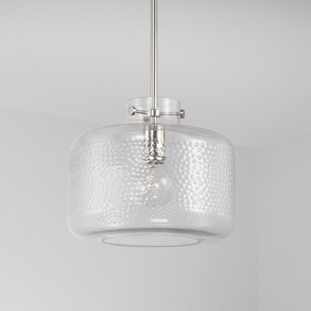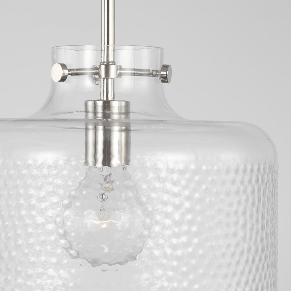 The unique pebble detailing of the glass cloche on the 1-Light Pendant in Polished Nickel gives an artisan touch to the classic silhouette.