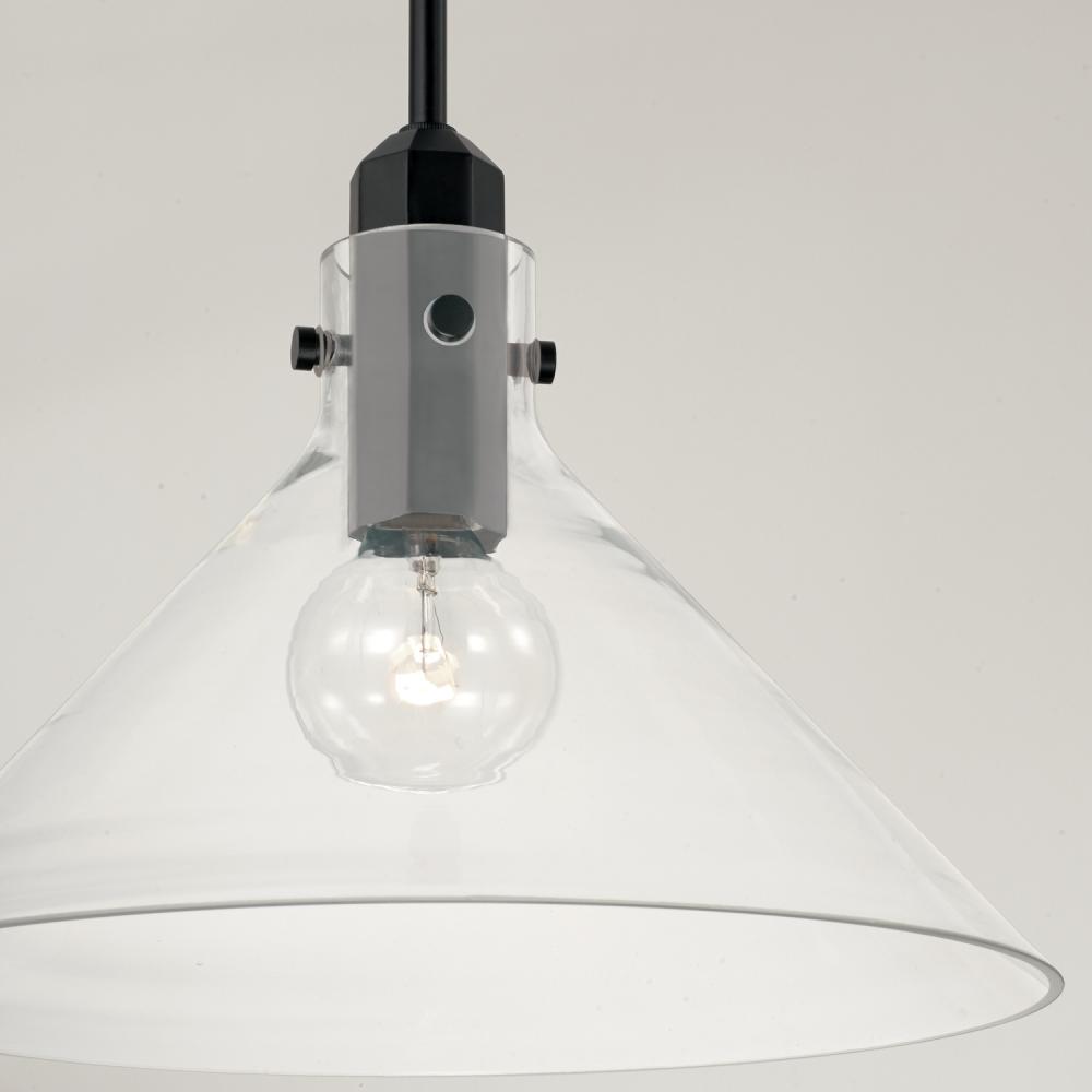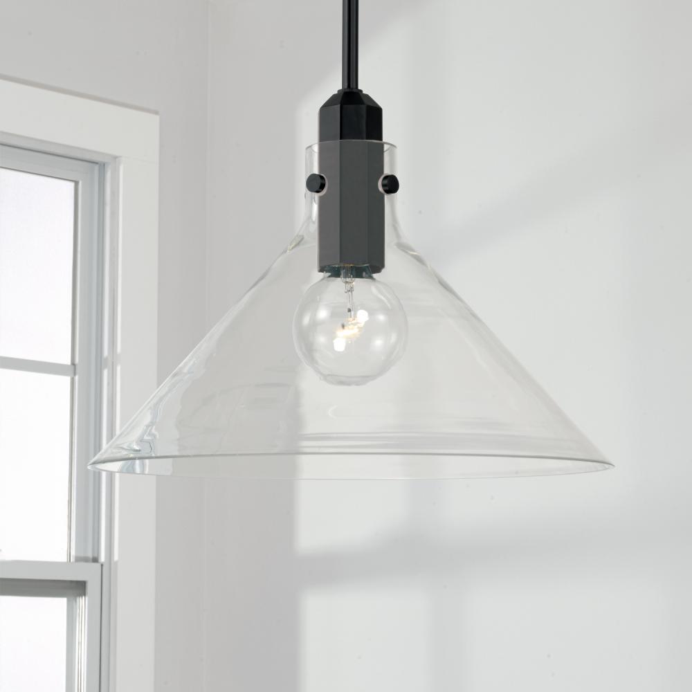 A modern take on midcentury style, the Greer Pendant brings understated style to any space. The faceted socket and rivet details in Matte Black adds a pop of personality to the tapered glass.