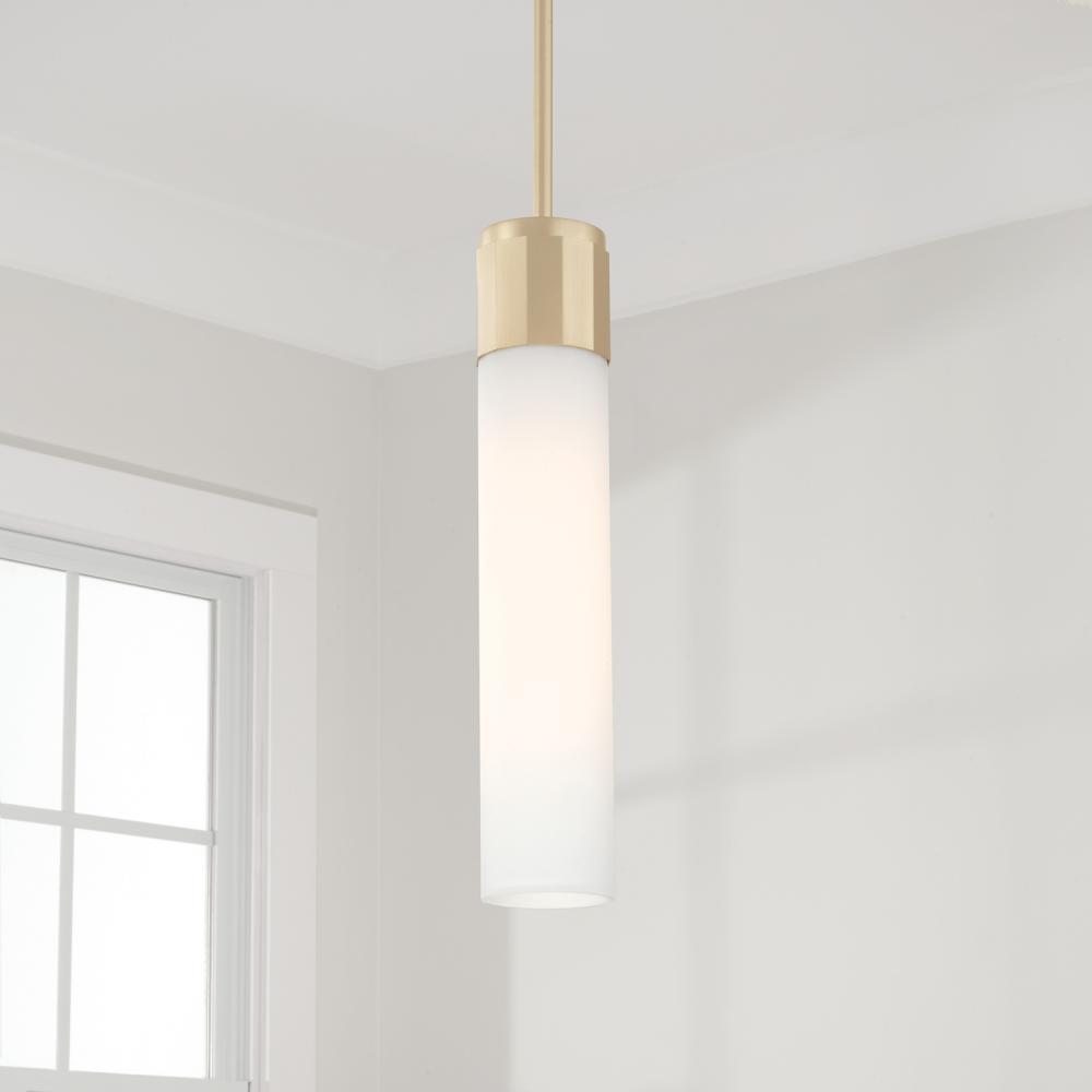 Sophisticated and stunning, the Sutton Glass Pendant puts a tailored touch on a simple form. The champagne sheen of Soft Gold faceted band complements the elongated frosted glass for elevated elegance.