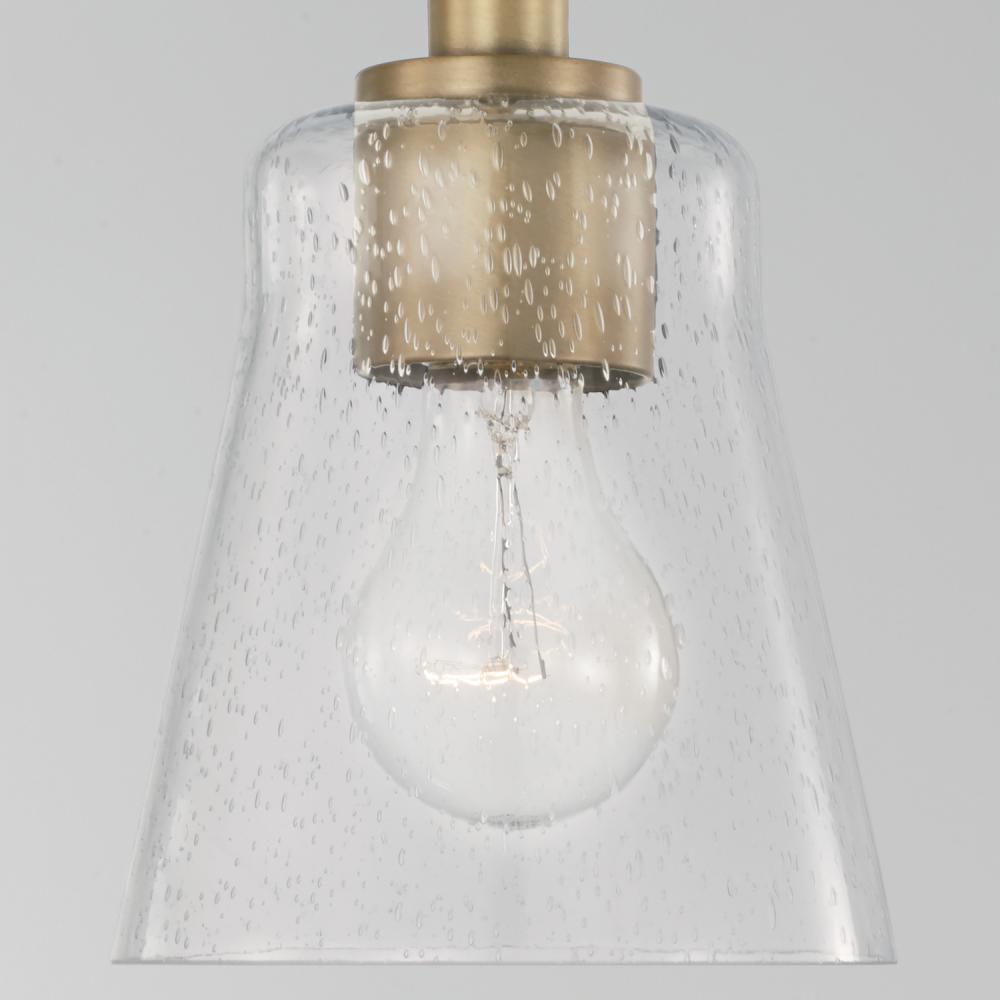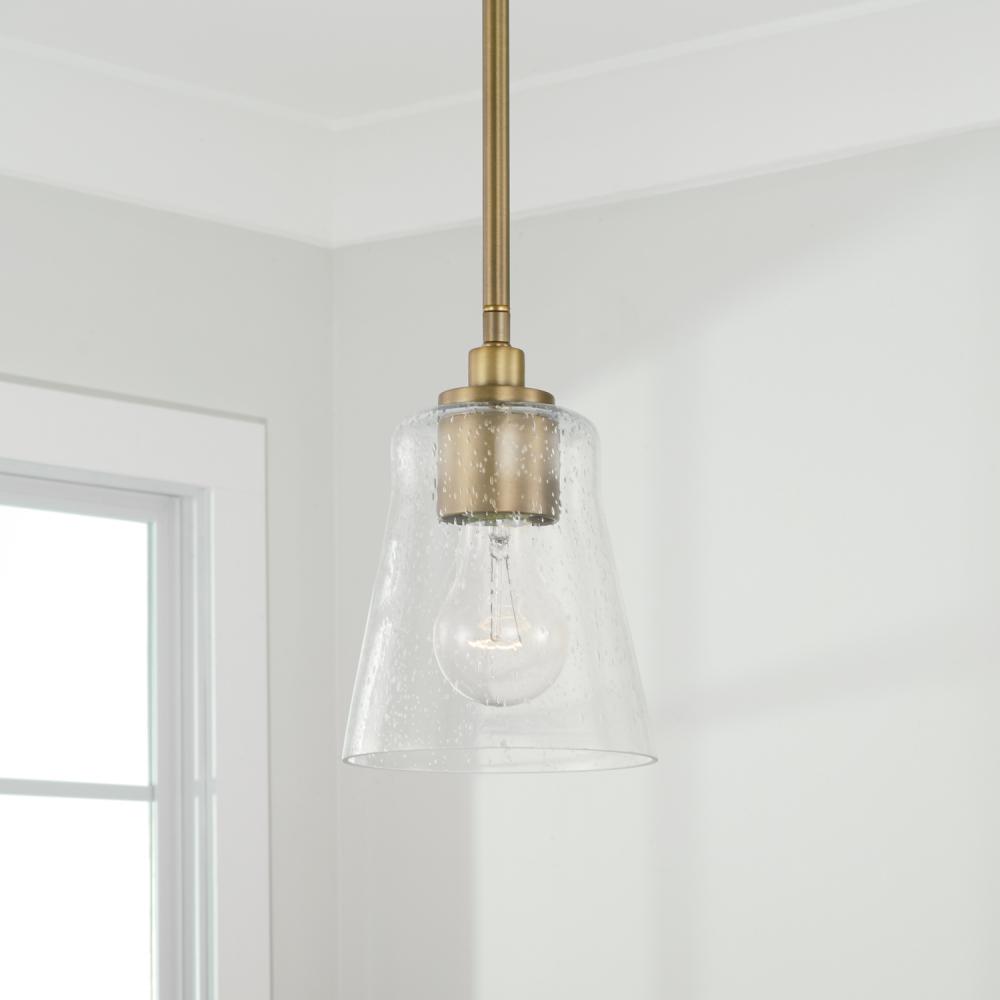 Simple and sleek, the Baker Mini Pendant for Homeplace brings standout style to signature pieces. Whether hung as a pendant or semi-flush, the Aged Brass finish beautifully accents the tapered seeded glass for versatility and sophistication.
