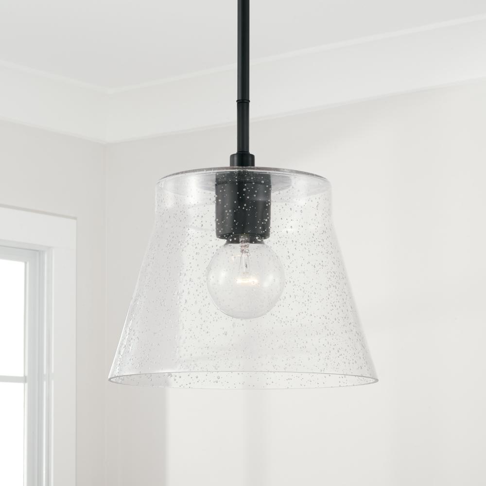 Simple and sleek, the Baker Small Pendant for Homeplace brings standout style to signature pieces. Whether hung as a pendant or semi-flush, the Matte Black finish beautifully accents the tapered seeded glass for versatility and sophistication.