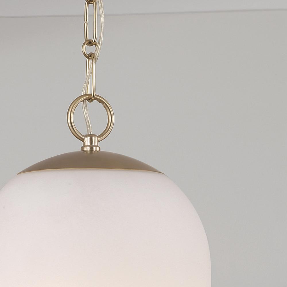 DETAILS: Soft White glass creates an ambient glow that's enhanced by the Matte Brass shine and designer chain.
