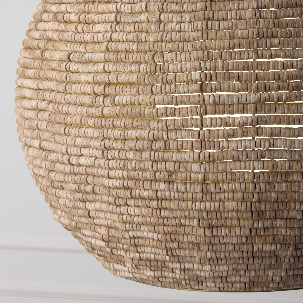 DETAILS: With thousands of hand-strung wooden beads, the open globe silhouette takes on a stunning dimensional appeal, complete with an inner Soft White glass globe and a Light Fawn finish.