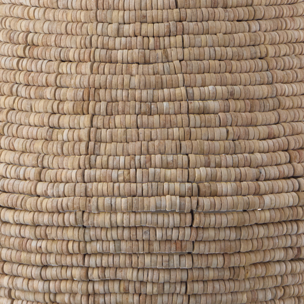 FINISH: A combination finish of handcrafted wooden beads painted in varying shades of tan and beige, and a honey-toned gold with subtle shine.