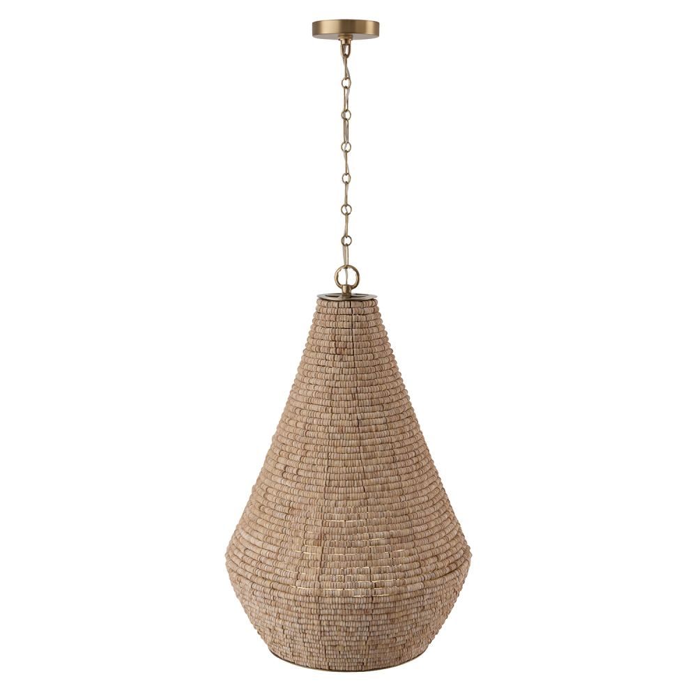 FINISH: A combination finish of handcrafted wooden beads painted in varying shades of tan and beige, and a honey-toned gold with subtle shine.