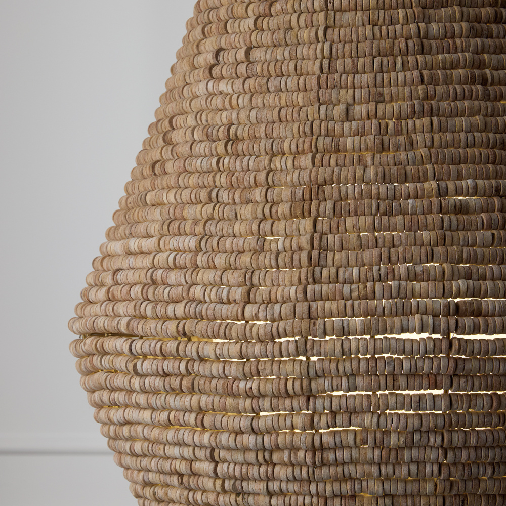 DETAILS: With thousands of hand-strung wooden beads, the open teardrop silhouette takes on a stunning dimensional appeal, complete with an inner Soft White glass globe and a Light Fawn finish.