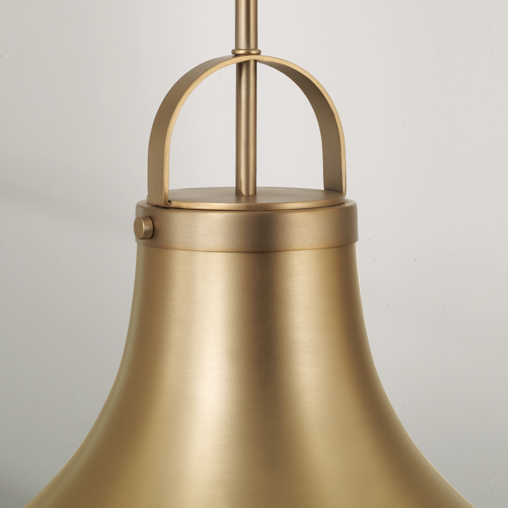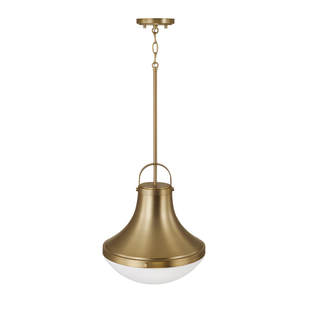 DETAILS: An Aged Brass finish and Soft White glass dome come together to form a flared drop silhouette, complete with subtle rivet details and oversized loop at the top.