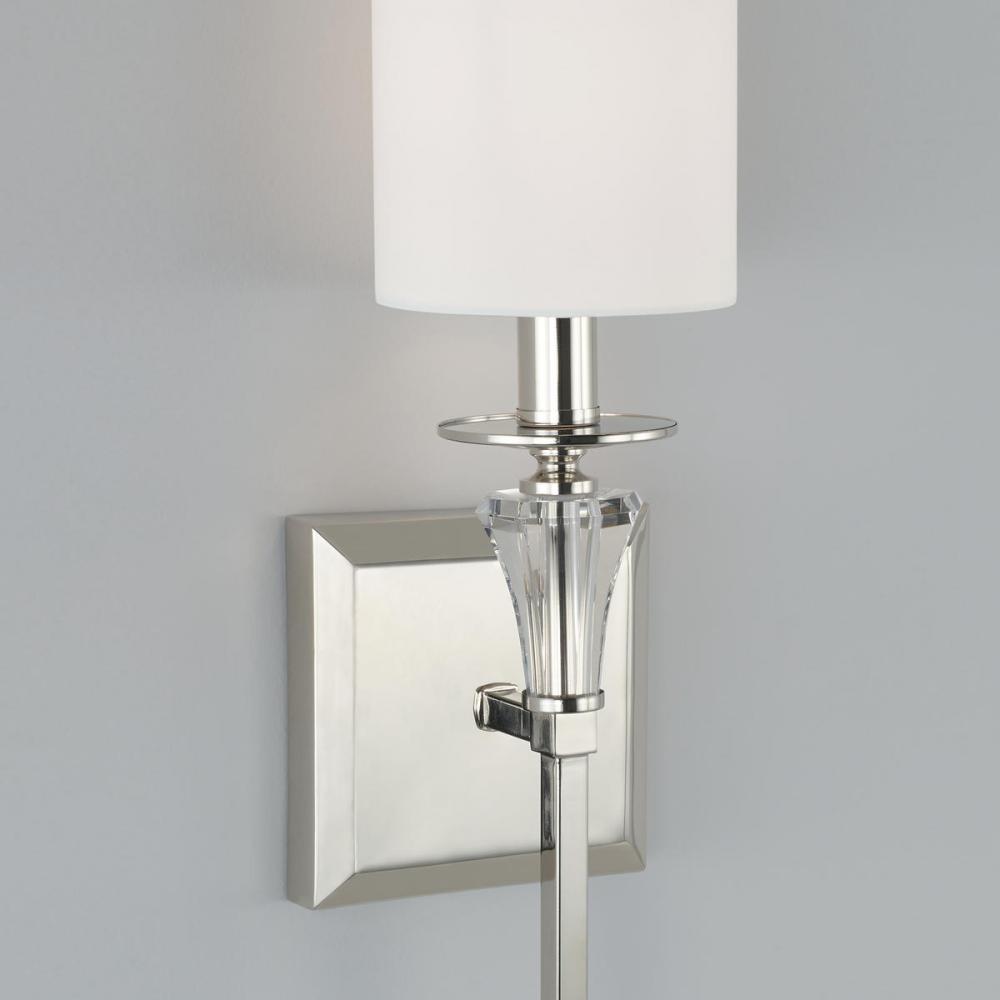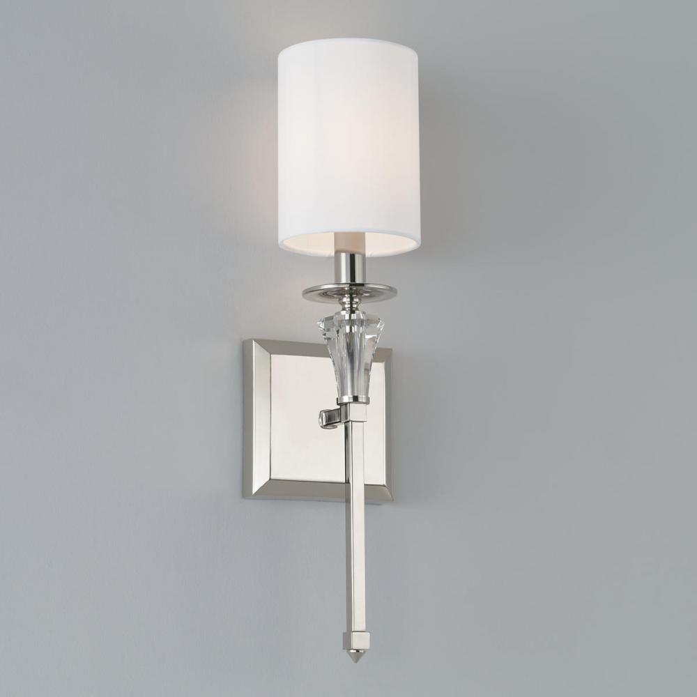 This polished nickel take on a classic sconce design is highlighted by K9 Crystal and topped with a white fabric stay-stright shade