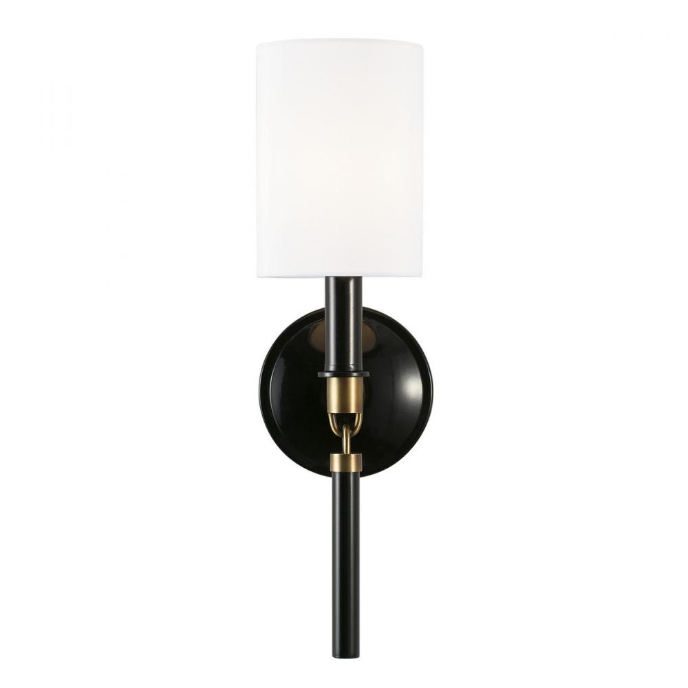The striking contrast of the Glossy Black finish with the tailored fabric shade gives a perfectly polished look to the Beckham 1-Light Sconce. The solid metal tassel detail is accented with Aged Brass loops for a sleek silhouette that is both bold and refined.