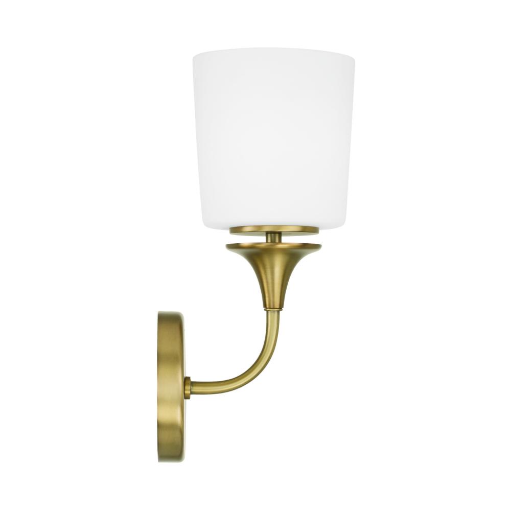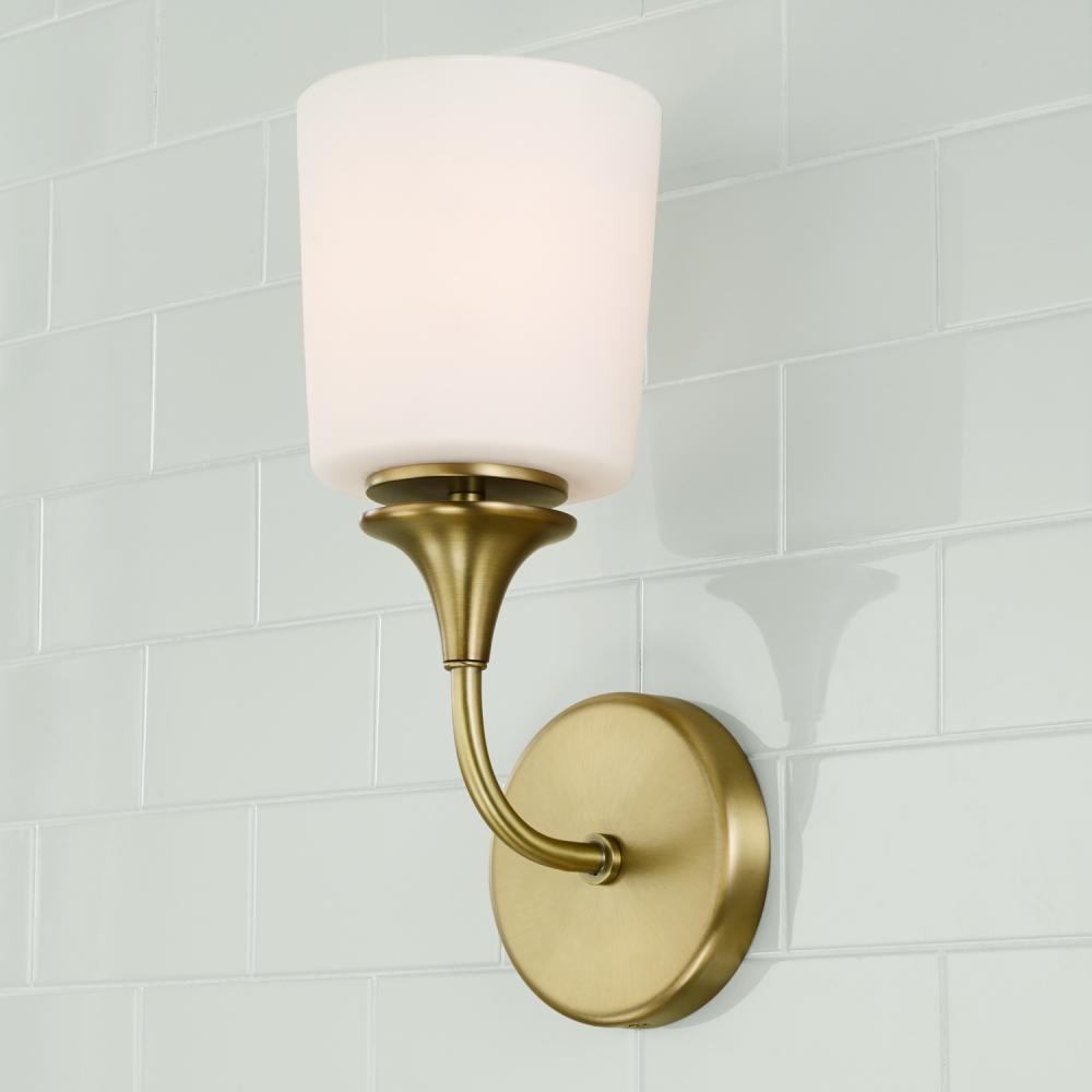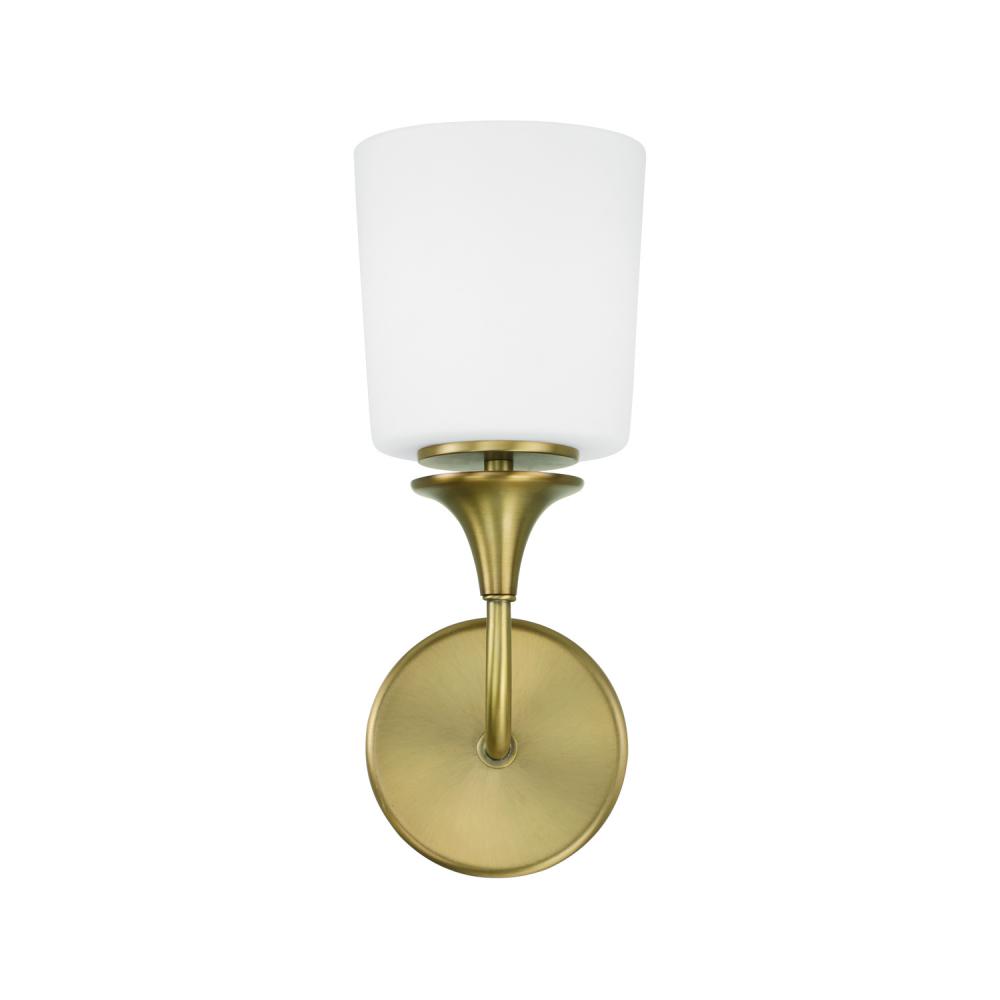 5.5"W x 13.75"H 1-Light Sconce in Aged Brass with Soft White Glass