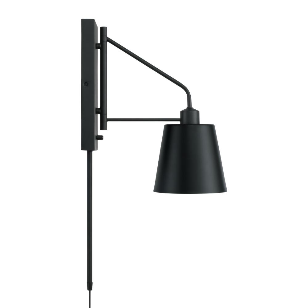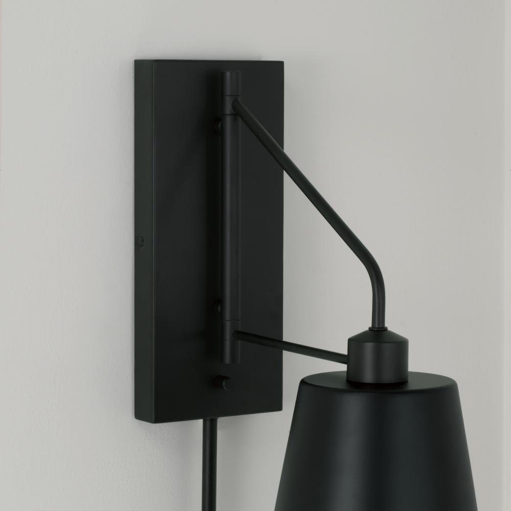 Spotlight distinct style with the Alden Sconce. The Matte Black finish with White interior delivers a sleek contrast, and the crisp, tapered metal shade swings from side to side and includes a dimmer switch bringing modern task lighting where you need it most. This versatile fixture includes a 12 cord cover and plug-in option.