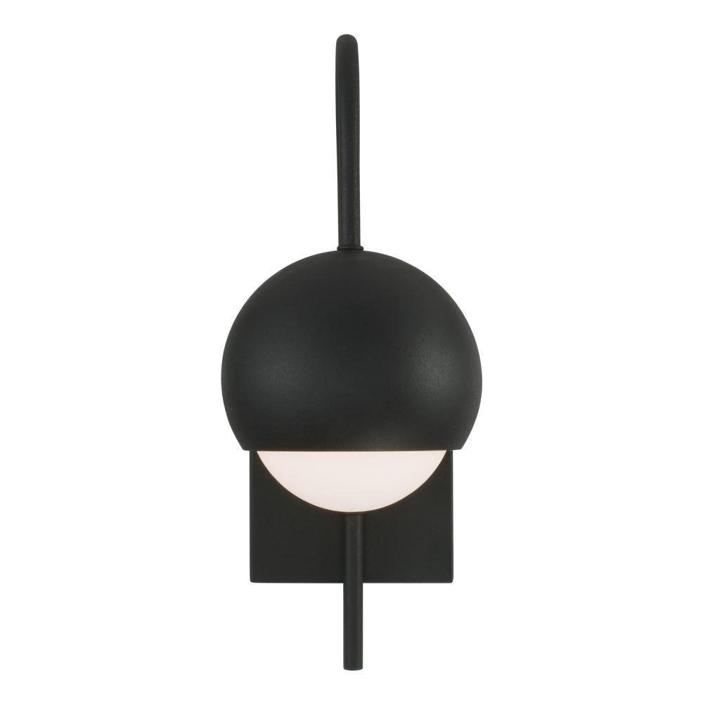 The streamlined Dolby Sconce spotlights retro chic style with Soft White glass encircled by a metal globe shade. The curved stem adds a playful touch, while the textured Black Iron finish creates dimension.