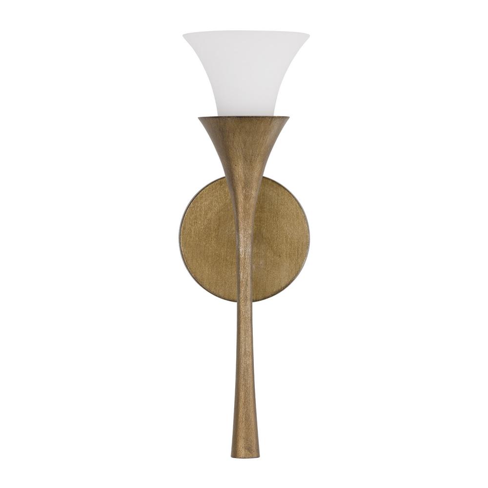 The Nola Sconce is a uniquely stunning luminaire in a classic candlesleeve design with a modern twist. Nestled into the flared silhouette, the Soft White glass detail casts a warm ambient glow against the rich, amber shimmer of the Mystic Luster finish.