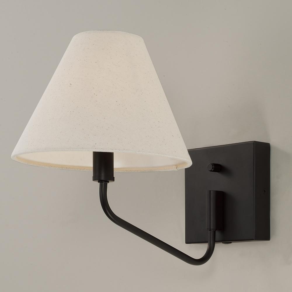 Soft angles and classic style create the Chadwick Sconce. The tapered White fabric shade brings a visual balance to the elegant, swiveling metal arm, finished in Espresso for sophisticated contrast. Includes a dimmer dial on the backplate and a plug-in option with 12 cord cover for effortless functionality.