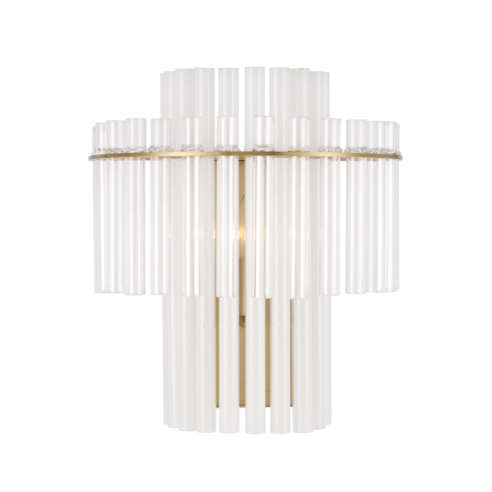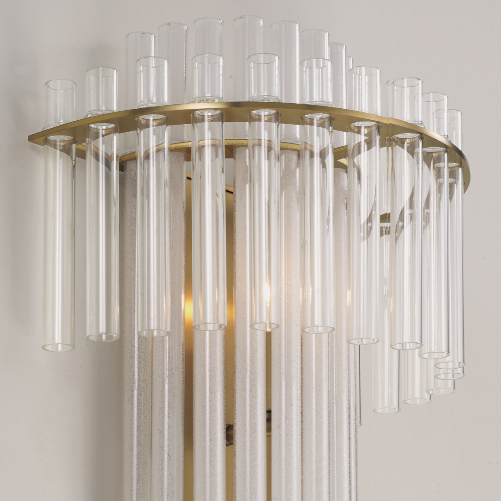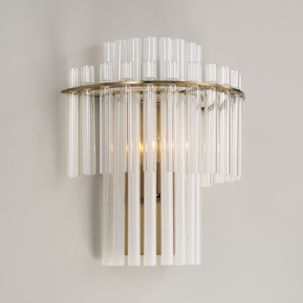 Illuminate captivating dimension. With an inner half-circle of long, etched glass tubes nestled inside an outer band of shorter, clear glass tubes, the Blair Sconce brings layers of enchanting shine to any space. The elegant Aged Brass finish perfectly complements the cascading silhouette.