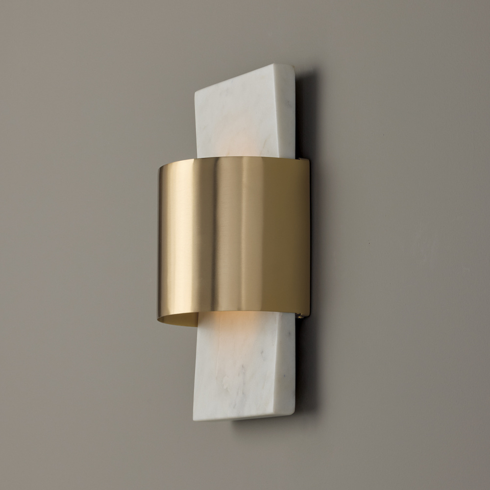Invite handsome style to any space with the Sidney Sconce. The natural white marble slab is slightly curved away from the wall to create an elevated, dimensional effect. Beautifully complemented by the bold brass cuff, the natural material is illuminated by the integrated LED of this wall-washing sconce.