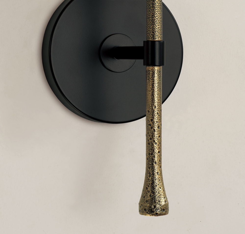 FINISH: A combination finish of a bronzy, distressed gold with an artisan crafted hammered texture, plus a powder coated, neutral black.
