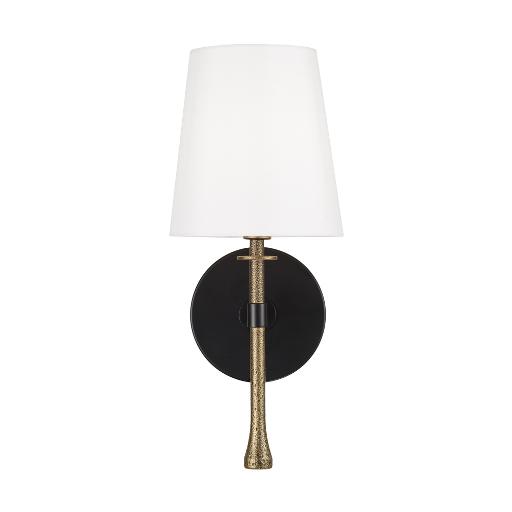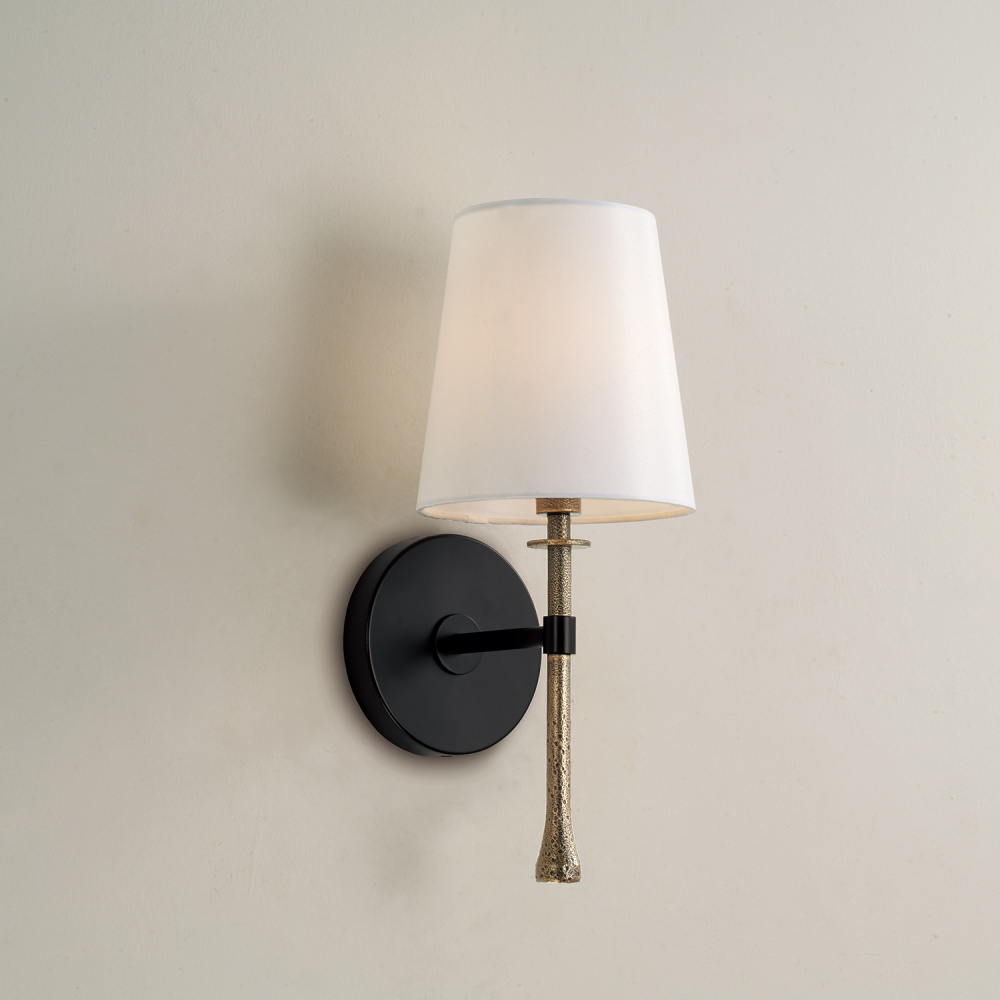 A fresh take on transitional design, the Hollis Sconce adds two-tone appeal and a touch of texture to a classic silhouette. This fixture seamlessly blends Matte Black with the textural, handcrafted Hammered Gold finish on the finial. A mini disc bobeche detail draws the eye, while the tapered White Fabric shade rounds out the style.