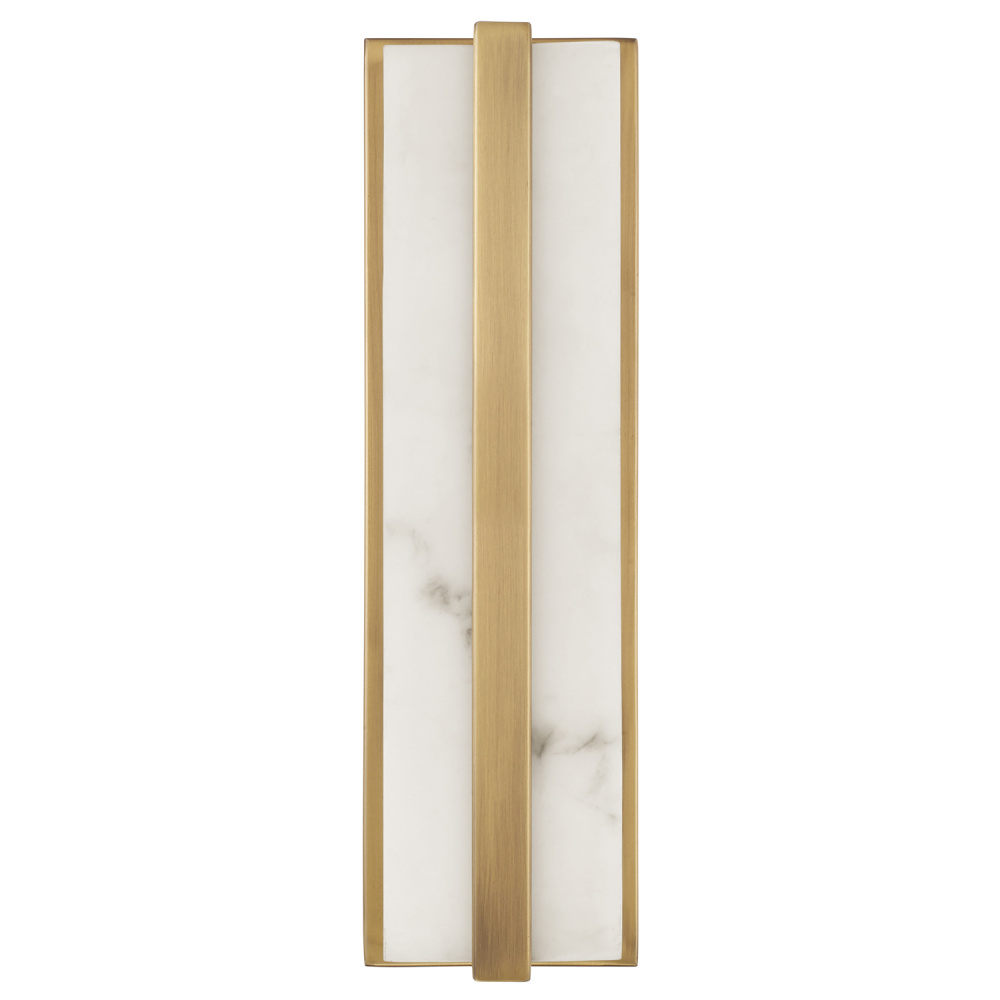 DETAILS: Streamlined and sleek, the rectangular form is crafted from Alabaster Glass with a full length Aged Brass backplate and band, plus integrated LED technology.
