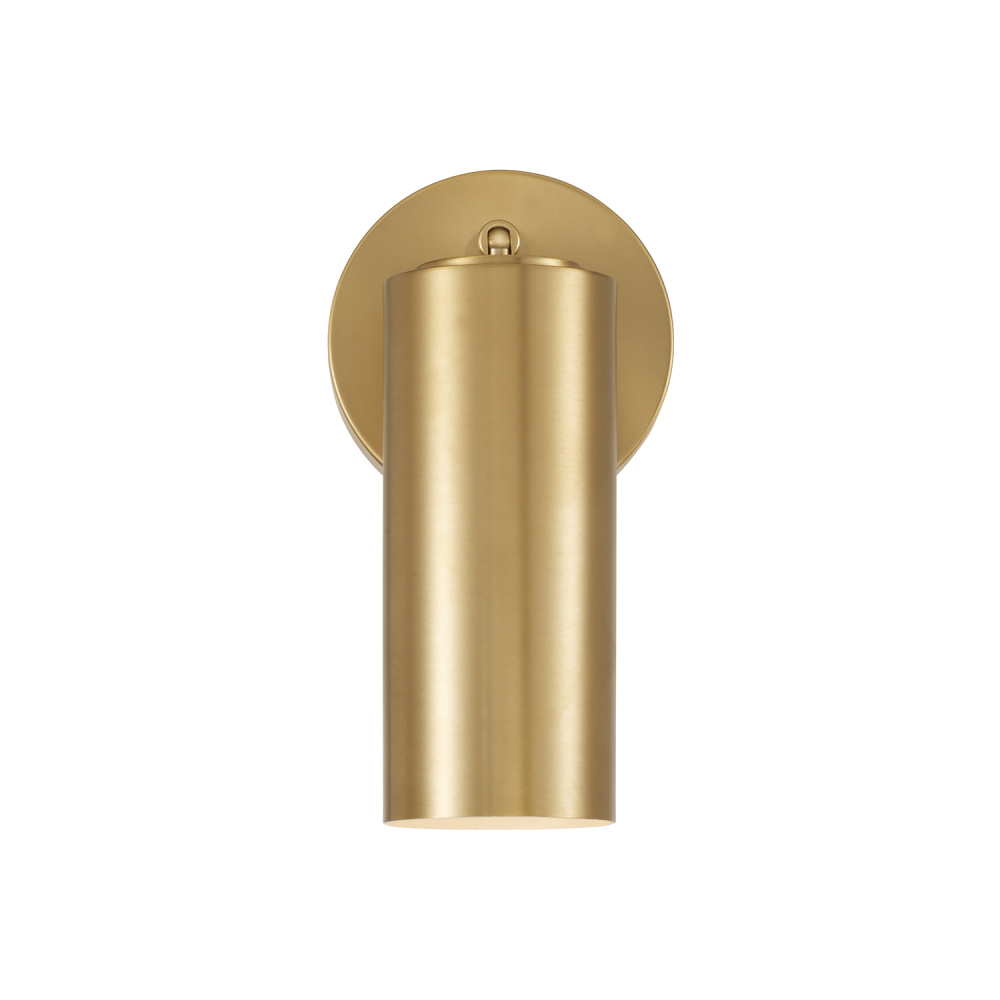 Smooth, cylindrical forms create the Robbie Sconce. Finished in Aged Brass, this contemporary luminaire showcases a touch of contrast with an interior White finish. The metal cylinder pivots to direct the illumination, bringing modern versatility to beautiful task lighting. Includes option to plug-in with a 12 Aged Brass cord cover.