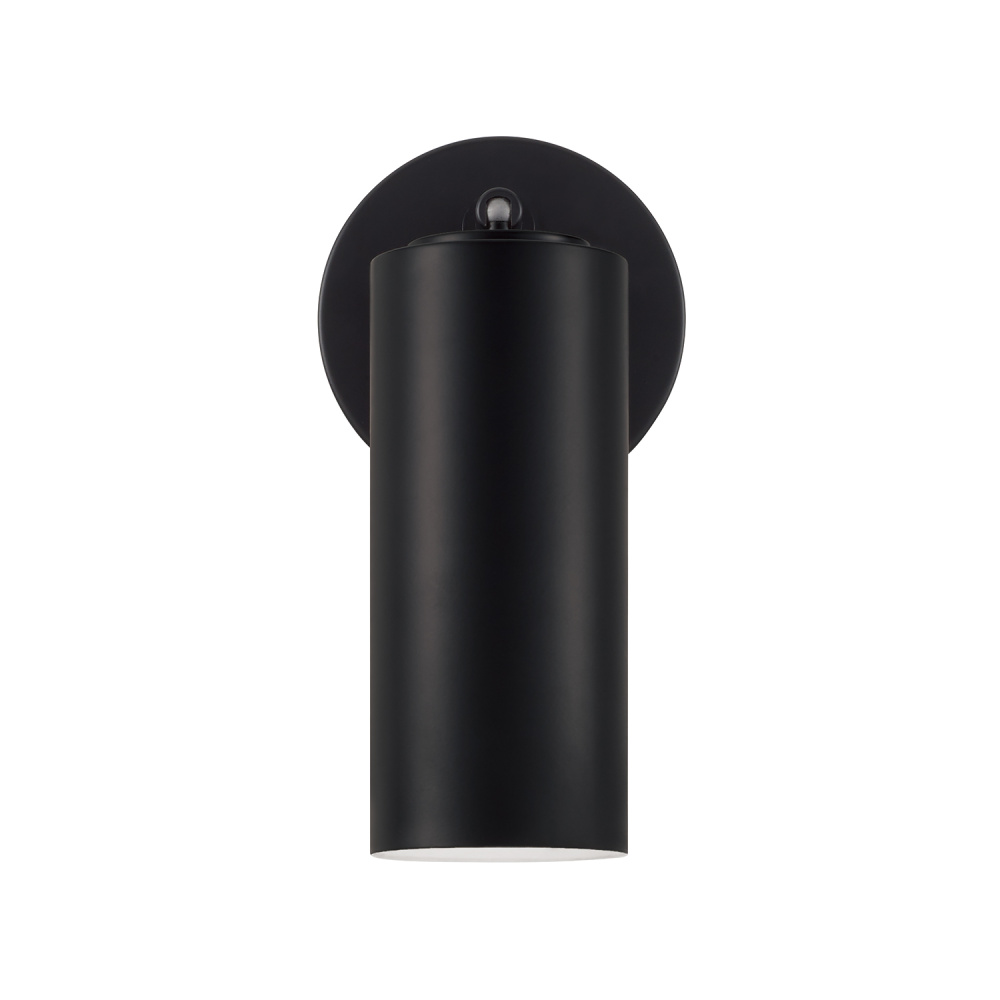 Smooth, cylindrical forms create the Robbie Sconce. Finished in Matte Black, this contemporary luminaire showcases a touch of contrast with an interior White finish. The metal cylinder pivots to direct the illumination, bringing modern versatility to beautiful task lighting. Includes option to plug-in with a 12 Matte Black cord cover.