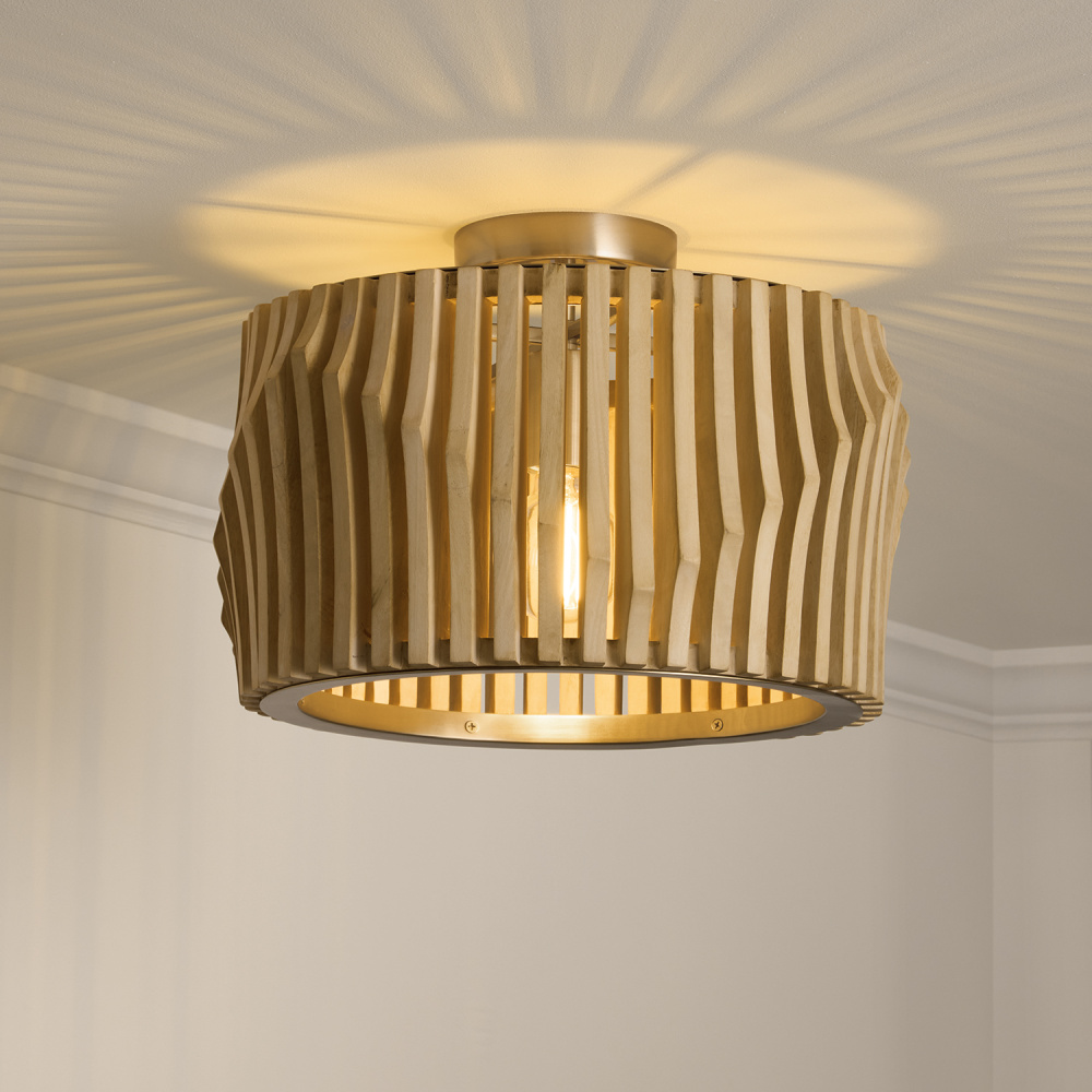 DETAILS: The carved slats of mango wood create an organic wave, complete with a touch of shine from the Brass finish. Artisan made and handcrafted; natural variation will occur. Can be hung as a pendant or semi-flush.