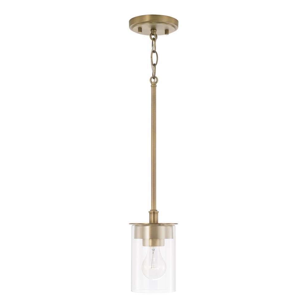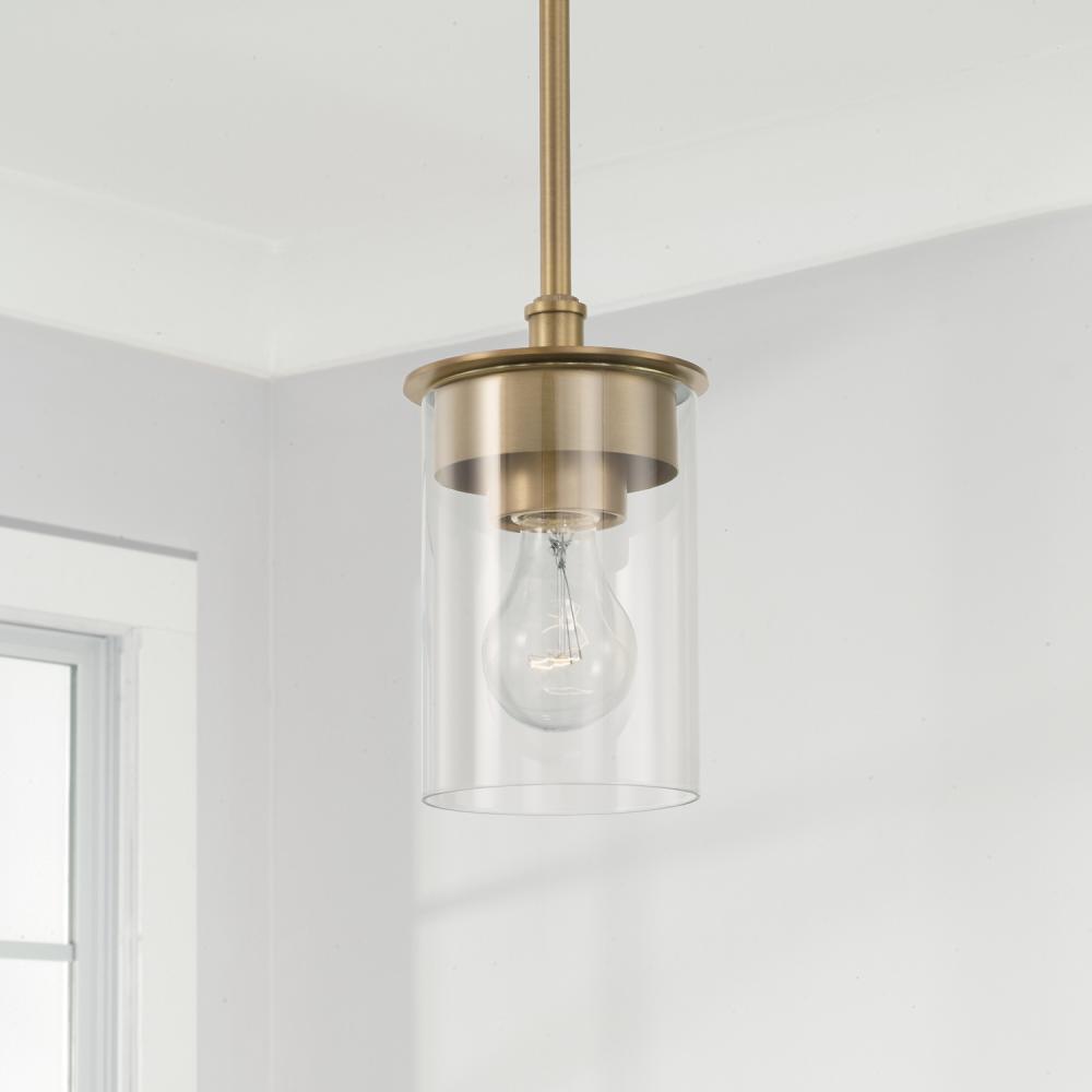 Clean lines and modern forms create the Mason Mini Dual Mount for Homeplace. Whether hung as a pendant or semi-flush, the Aged Brass finish accents the designer details for the ultimate style versatility.
