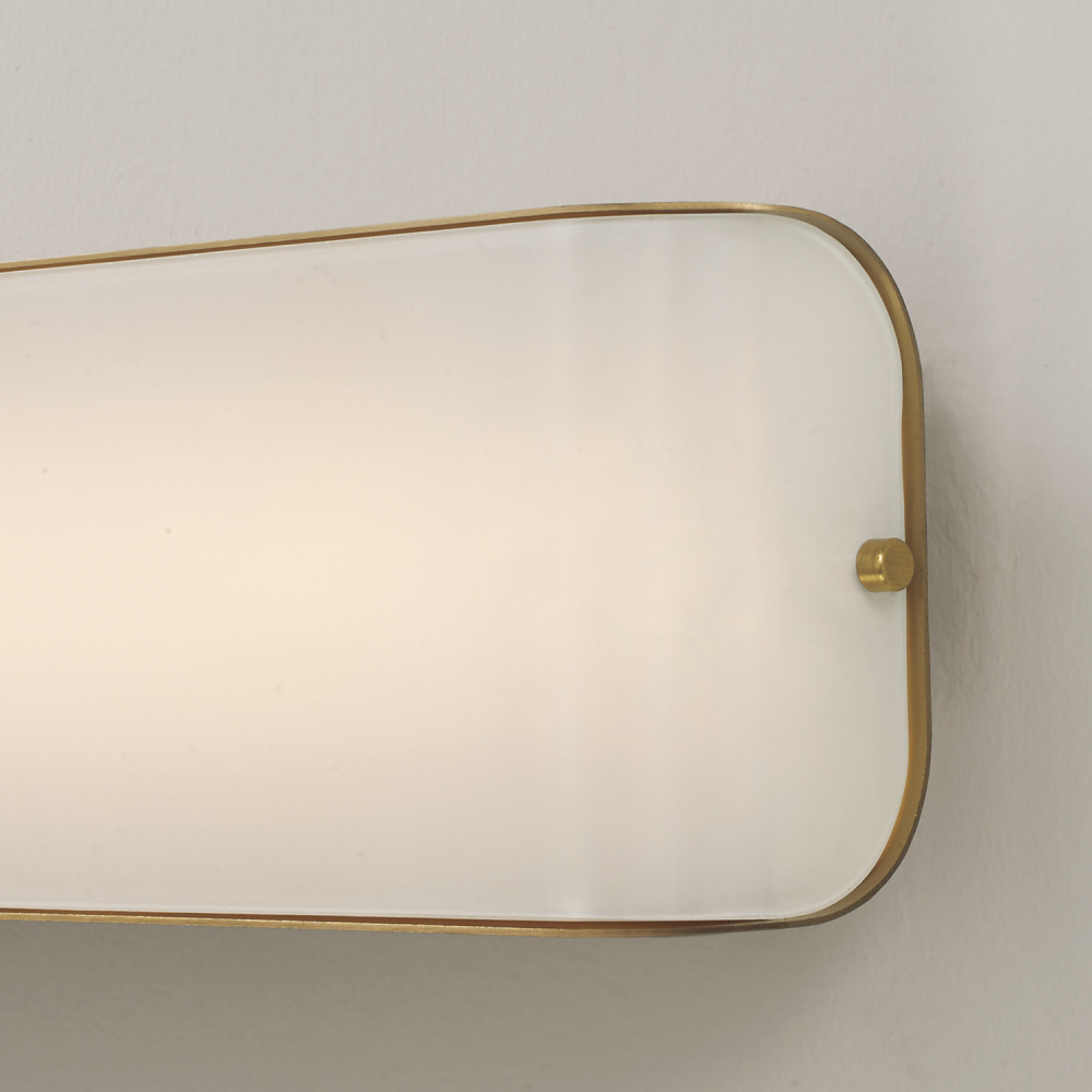 DETAILS: Grounded by an Aged Brass metal base, the curved glass panel creates a smooth, beautiful glow from the chic silhouette.