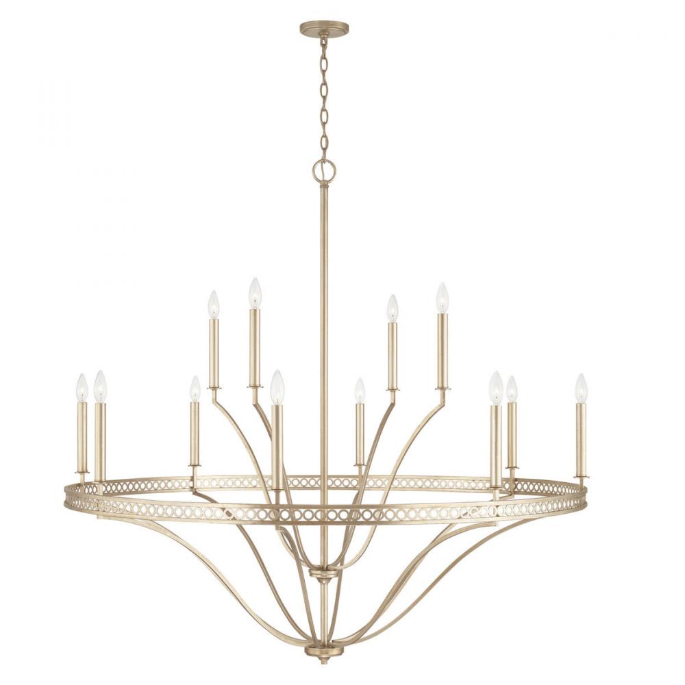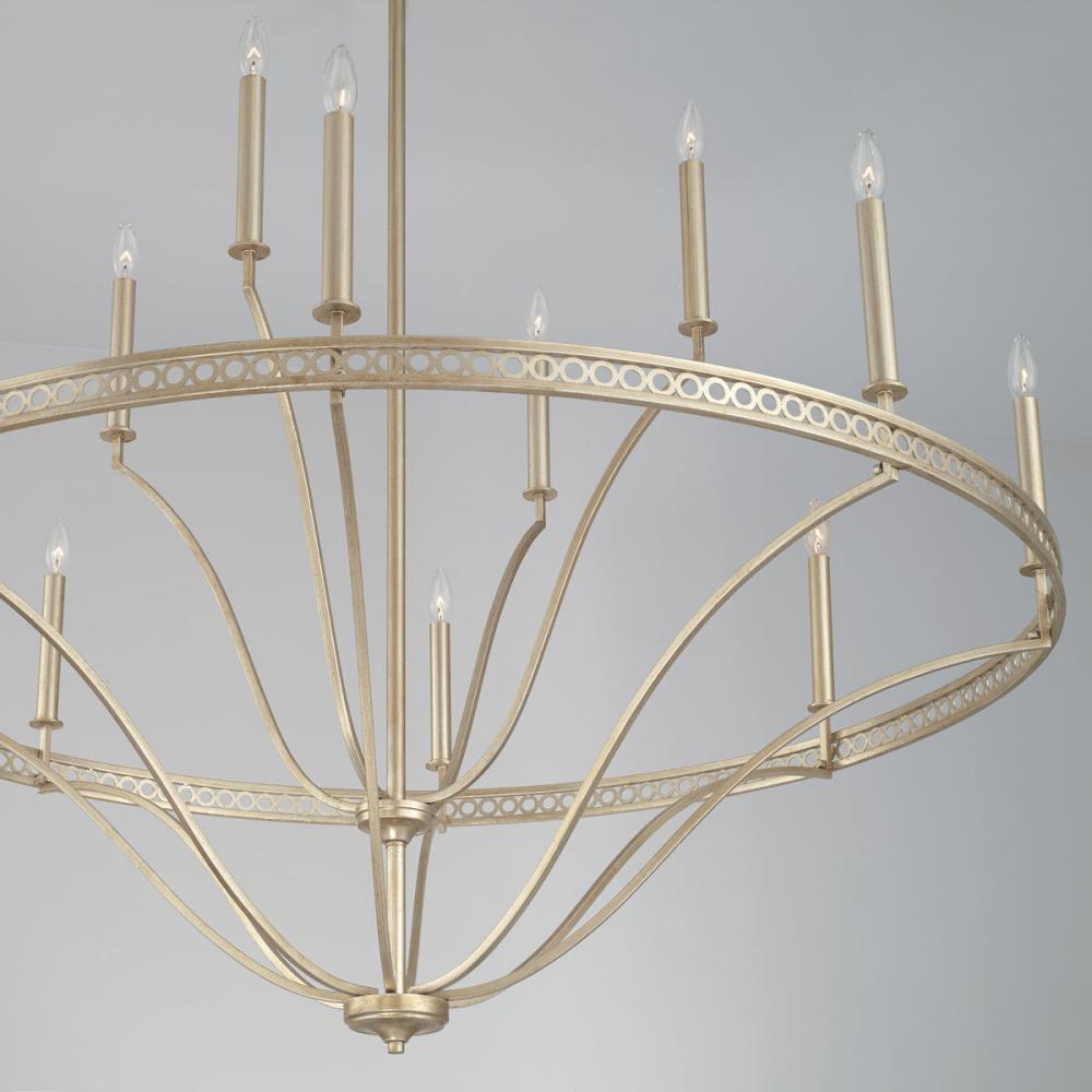Graceful curves and an ornate pattern create the grand scale of the Isabella 12-Light Chandelier. The intricate band of circles is finished in Winter Gold for a relaxed, yet regal style.