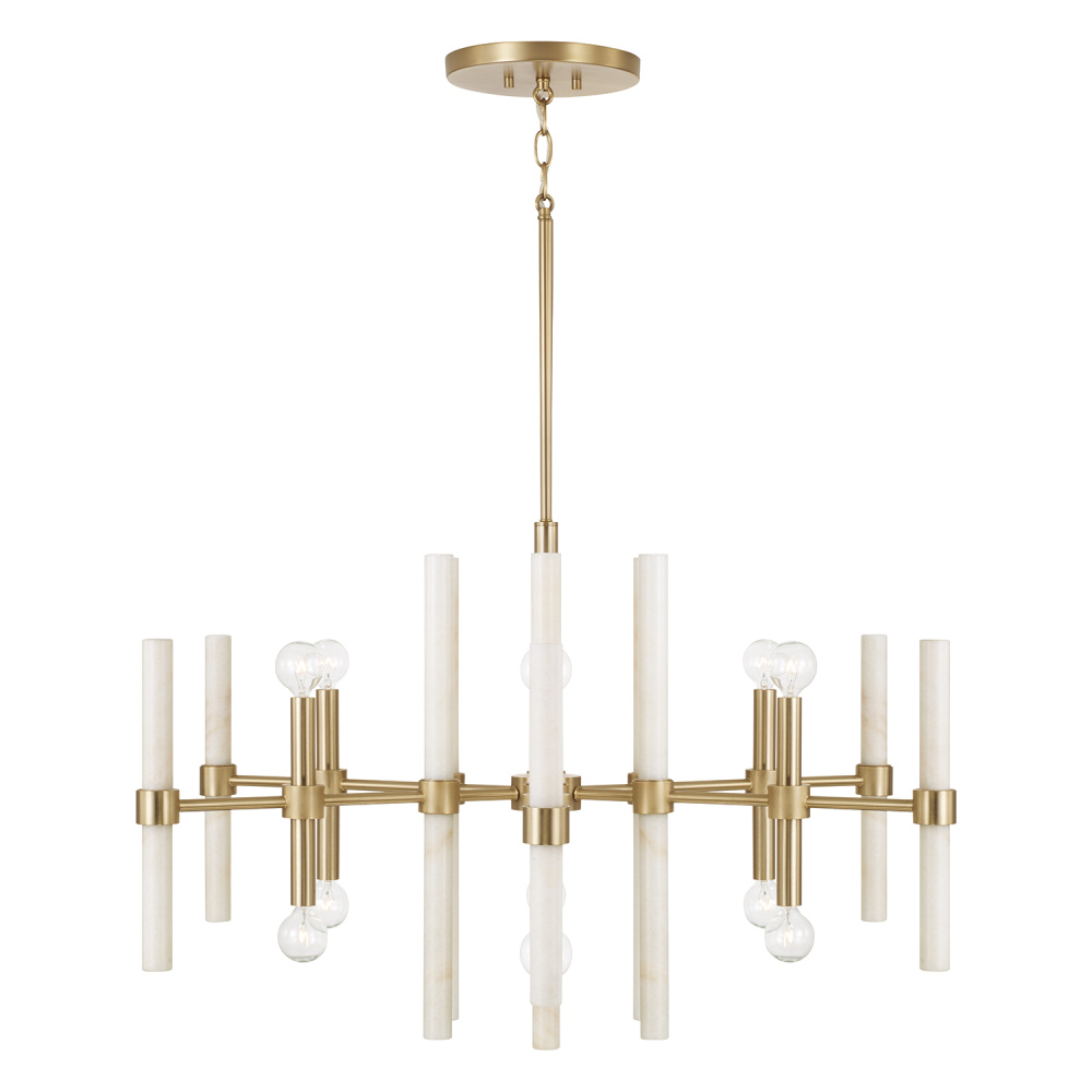 Beautifully balanced in form and function, the Marlow Chandelier pairs designer details with natural beauty. Held at the center, the ivory marble pillars draw the eye up and down the luminaire, creating a stunning backdrop for the double-socketed candle sleeves in top-to-bottom illumination. The Matte Brass finish creates glimmers of shine from every angle.