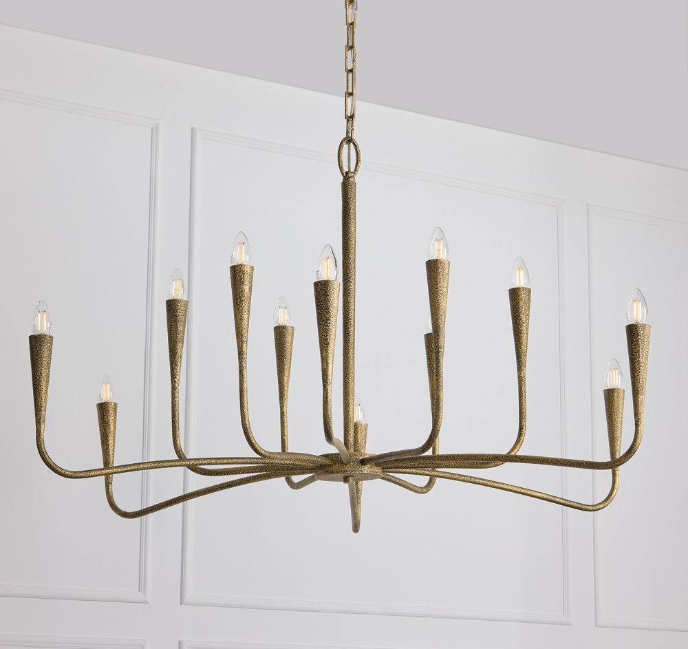 A unique, sweeping silhouette and handcrafted finish form the Savari Grand Chandelier. A smooth transition between arms and candle sleeves gives this luminaire a seamless look, complemented by the elevated aesthetic of slightly sunken sockets and designer chains. With layers of hand-painted texture, the Artisan Gold finish creates captivating dimension at every glimpse.
