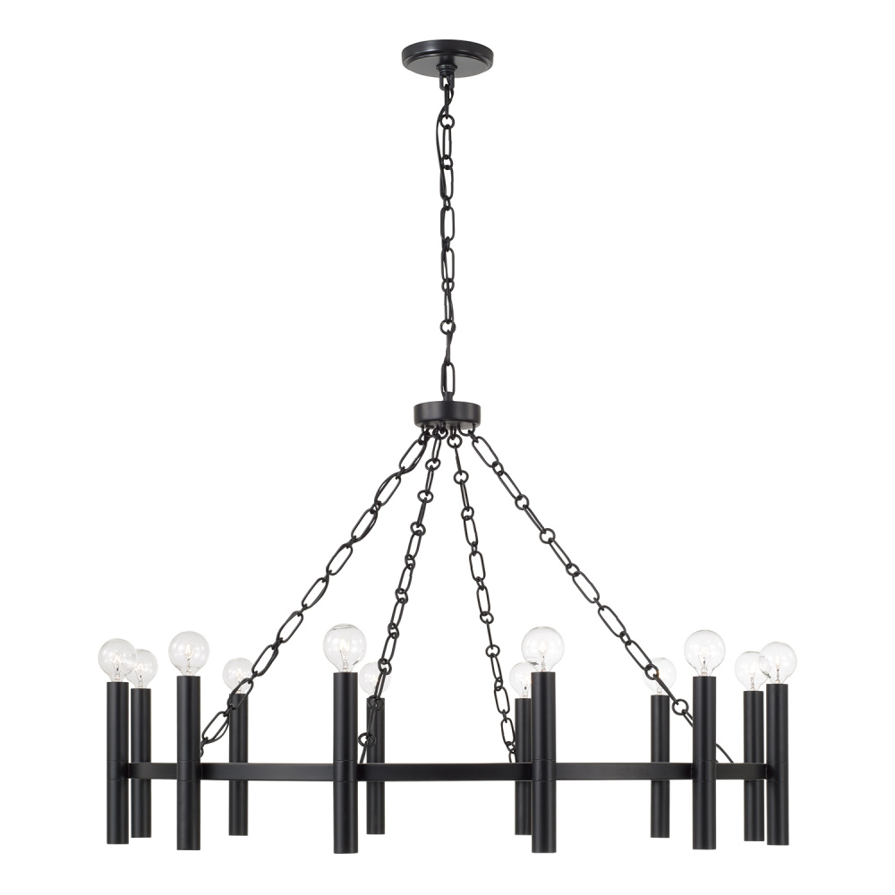 A classic ring silhouette and designer details create the Winton Medium Chandelier. Placed on the outside of the frame, the candle sleeves extend beyond the bottom of the ring, held by alternating loop chains for a unique take on the traditional style. The Matte Black finish punctuates the style.