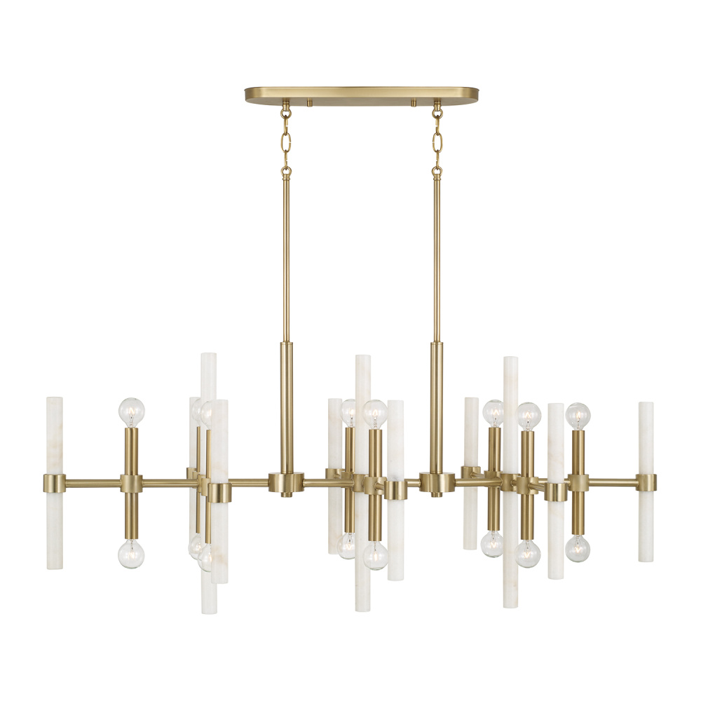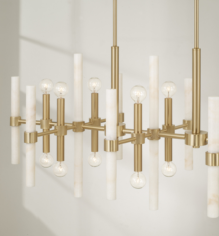 Beautifully balanced in form and function, the Marlow Linear Chandelier pairs designer details with natural beauty. Held at the center, the ivory marble pillars draw the eye up and down the luminaire, creating a stunning backdrop for the double-socketed candle sleeves in top-to-bottom illumination. The Matte Brass finish creates glimmers of shine from every angle.