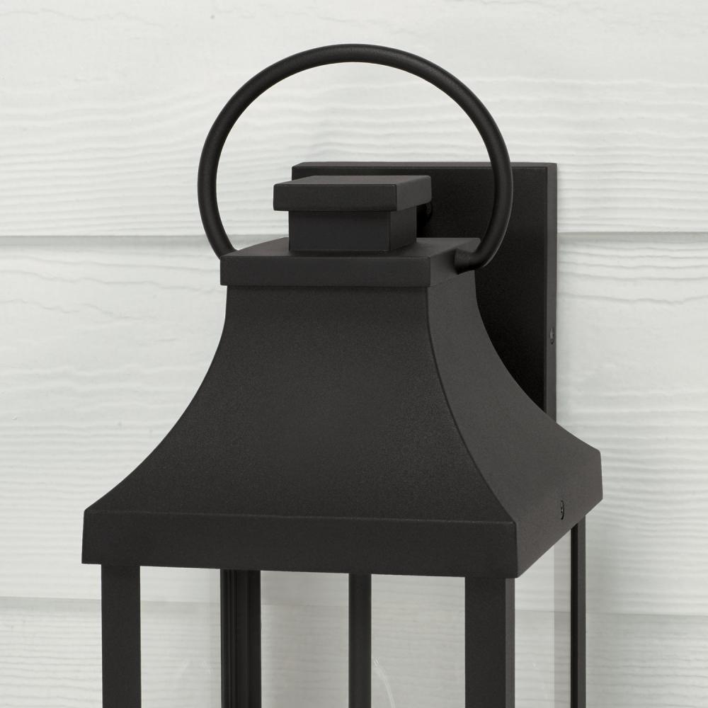 Transitional meets modern with the Bradford Medium Wall Lantern. The bold lines and an oversized ring in a Black finish adds classic curb appeal to your home. Part of our Rain or Shine Collection and backed by our five-year warranty.