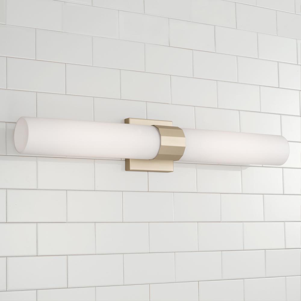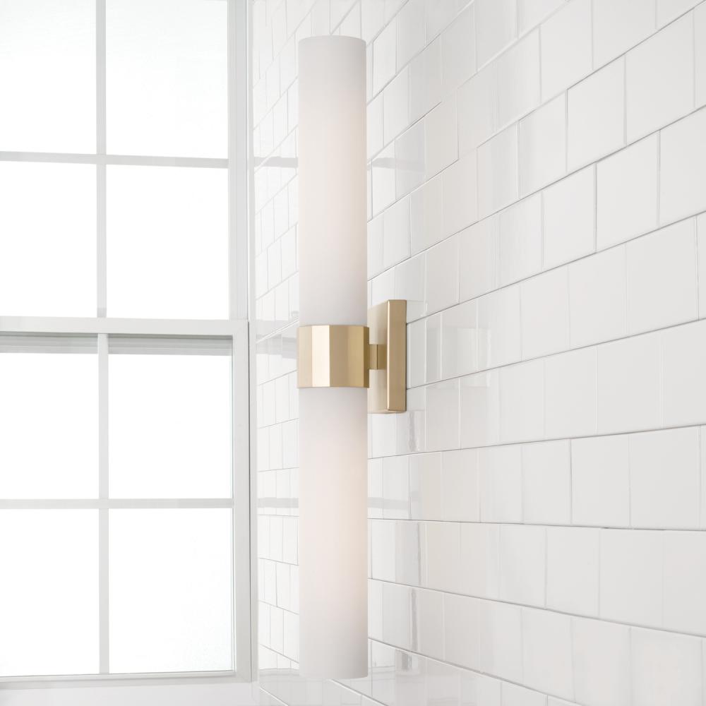 Sophisticated and stunning, the Sutton Dual Sconce puts a tailored touch on a simple form. The champagne sheen of Soft Gold faceted band anchors the two frosted glass shades for elevated elegance.